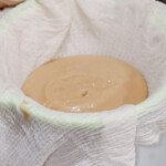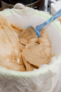 Put bean paste in a large cheesecloth and set over a strainer. You can let it sit for half an hour or use a spatula to press out some of the excess water. The end result should be about 700g or 3 cups, and have mashed potato consistency.