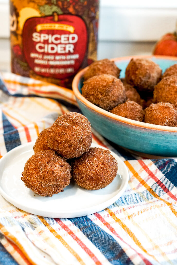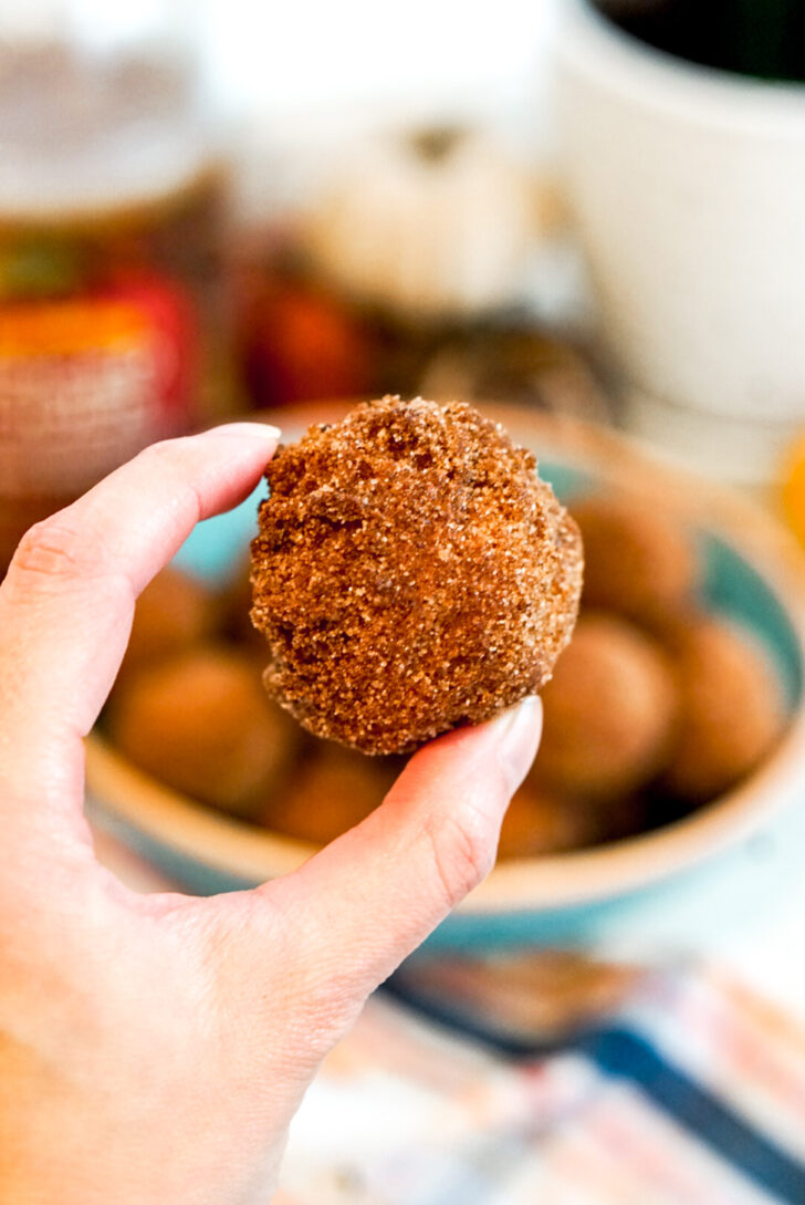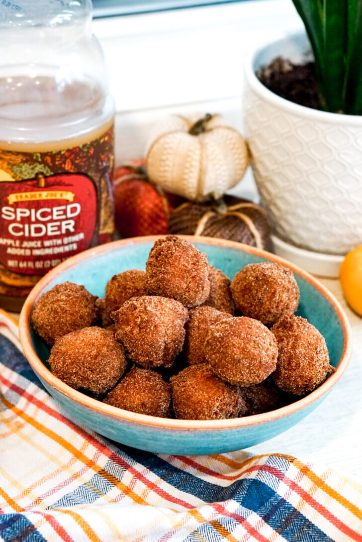 The super strong apple flavor comes from a reduction of both apple cider and applesauce. The chewy, bouncy texture comes from mochiko, and the essence of autumn comes from the warm spices like cinnamon and nutmeg. I simplify the deep frying step by doing donut holes dropped in with a cookie scoop rather than trying to cut out rings. Finally, the fresh, warm apple cider mochi donuts get dusted in cinnamon sugar coating. Itโs perfection.
