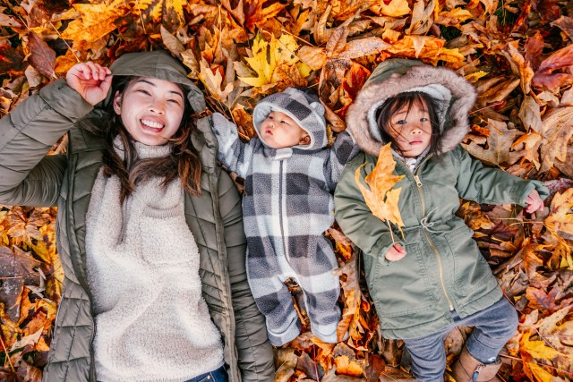 This one is a great way to get little kids smiling at the camera. Grab a bunch of leaves and throw them on three!