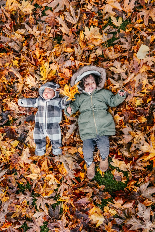 Our toddler thought this was super fun to lay down in the leaves, especially once she saw baby sister doing it. Also much easier to ensure that everyone is looking at the camera. Plus, look at what an impact the leaves make!