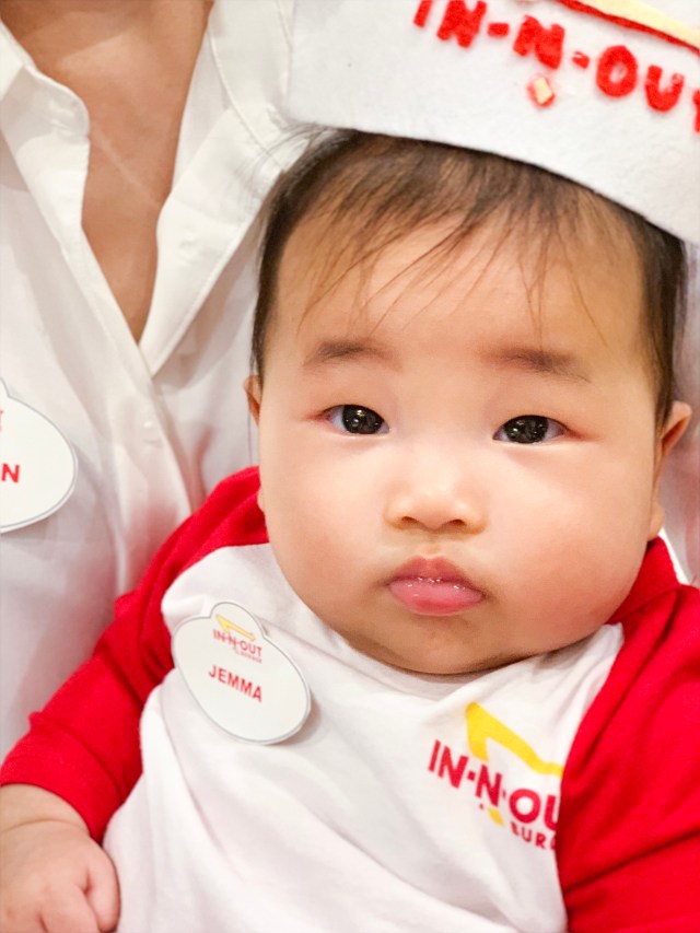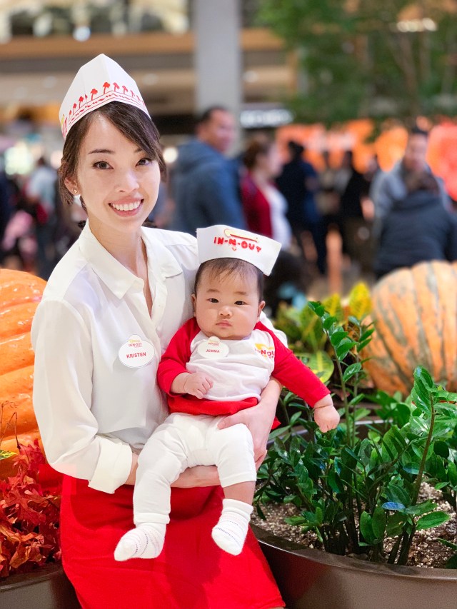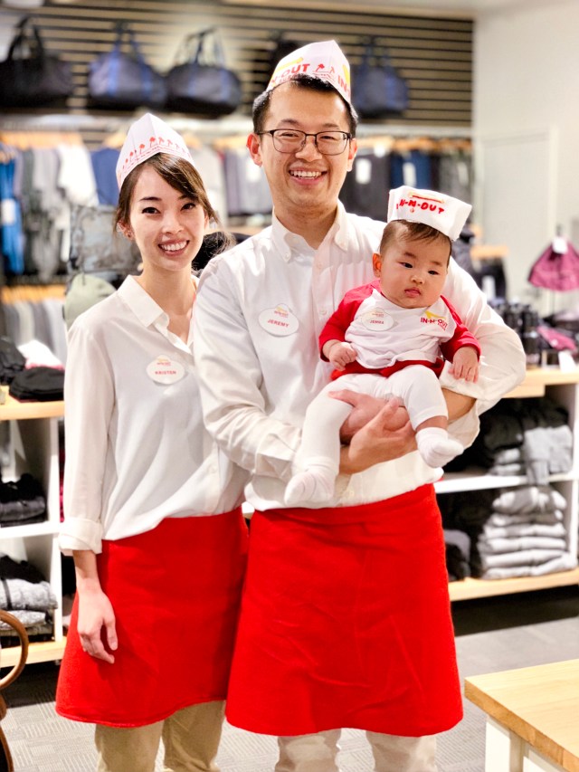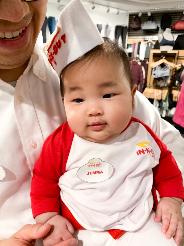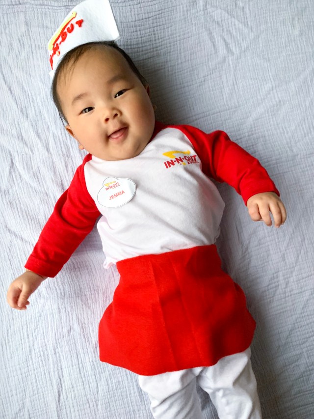 The costume is actually SUPER easy to DIY. The In-n-out hats are free if you visit any store. I had my sister bring some for us from California. Then, just wear all white (or tan pants, if you donโt have white). Top it off with a red apron, and youโre basically done.