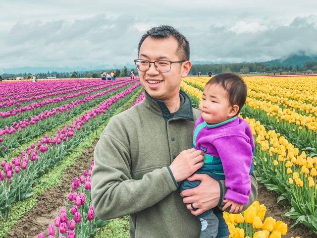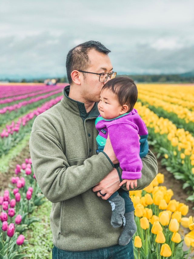 Iโd never been to see the Skagit Valley tulips before, and we thought this would be a good year to go so we could take more baby photos. For those of you who donโt live in the Seattle area, there are tulip fields about 1.5 hours from Seattle that bloom every spring. Tons of people go just to take photos in the fields. Itโs similar to the Carlsbad flower fields near San Diego. Theyโre nice to look at, but it sure does get crowded.