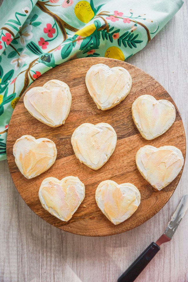 For the watercolor effect, just take your spatula and swipe over the tops of the cookies, smoothing out the surface. Thatโs it! If you have too much frosting, just scrape your spatula on the edge of a bowl or on a towel. (Note: You donโt need to put your cookies in the fridge before smoothing out the tops; you want the buttercream to still be wet so the colors run into each other.)