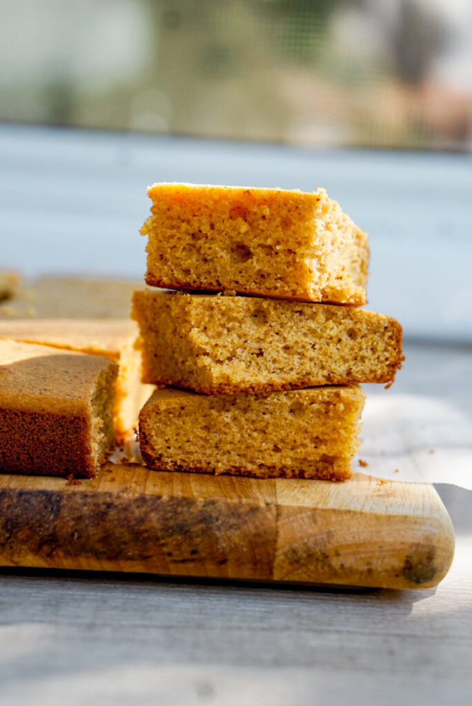 As I mentioned above, this recipe is very close to a traditional cornbread with a crumbly texture. If you’re looking for something more mochi-like, as in more stretchy and gooey, you’ll need to increase the amount of liquid. Try adding up to a half cup more of milk, coconut milk, buttermilk, or sour cream if you wish. In my Instagram video, I made a version where I added an extra half cup of sour cream, making the overall texture more fluffy and similar to a cakey butter mochi.