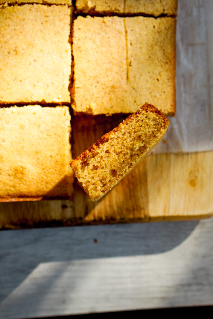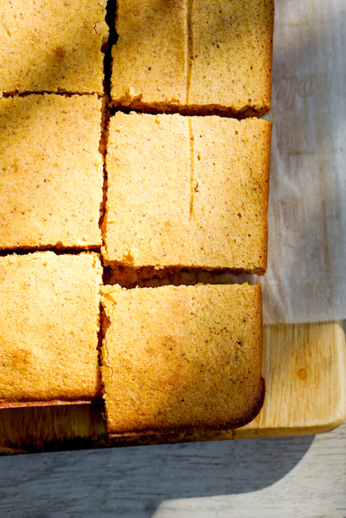 It seems obvious, but you’ll need yellow cornmeal for this recipe. I’ve seen a few popular sweet corn mochi cake recipes going around social media that call for pureeing fresh corn in a blender or food processor. While I’m sure that tastes amazing, since I don’t normally do that for my cornbread, I opted to keep it simple with this recipe as well.