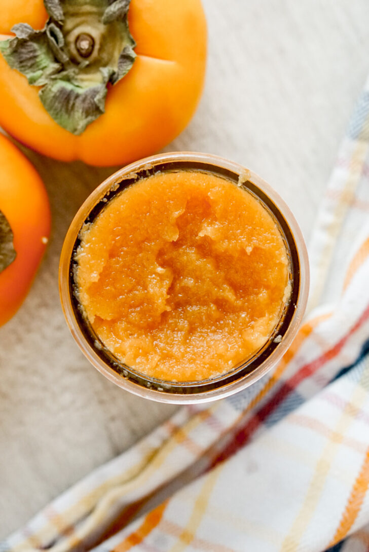 Again, no special tools! Just make sure you have something that can blend if using fuyu persimmons, such as a blender, immersion blender, or food processor. Also prepare a jar to hold your jam. 2 persimmons makes enough to fill a repurposed Oui by Yoplait glass yogurt jar, which is about 5 oz. (Did you know you can buy lids specifically for Yoplait jars?)