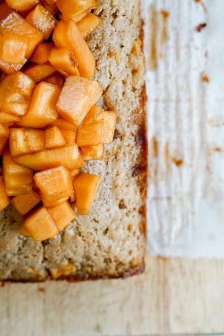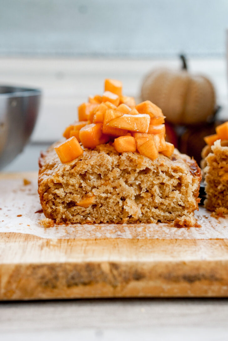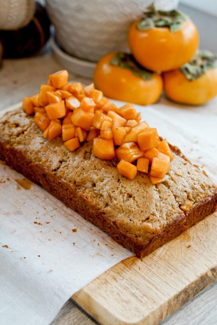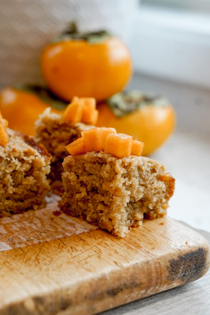This cake is baked in an 8×4 inch loaf pan. However, don’t expect it to have the tall loaf shape like a pound cake or banana bread. It’s meant to be more flat and cut into squares, similar to brownies. This gives it a nice flat surface for the cubed persimmons to rest on. I tried increasing the cake batter to create a loaf shape, but the fruit fell off the top at the end and didn’t have the right balance of persimmon to cake.