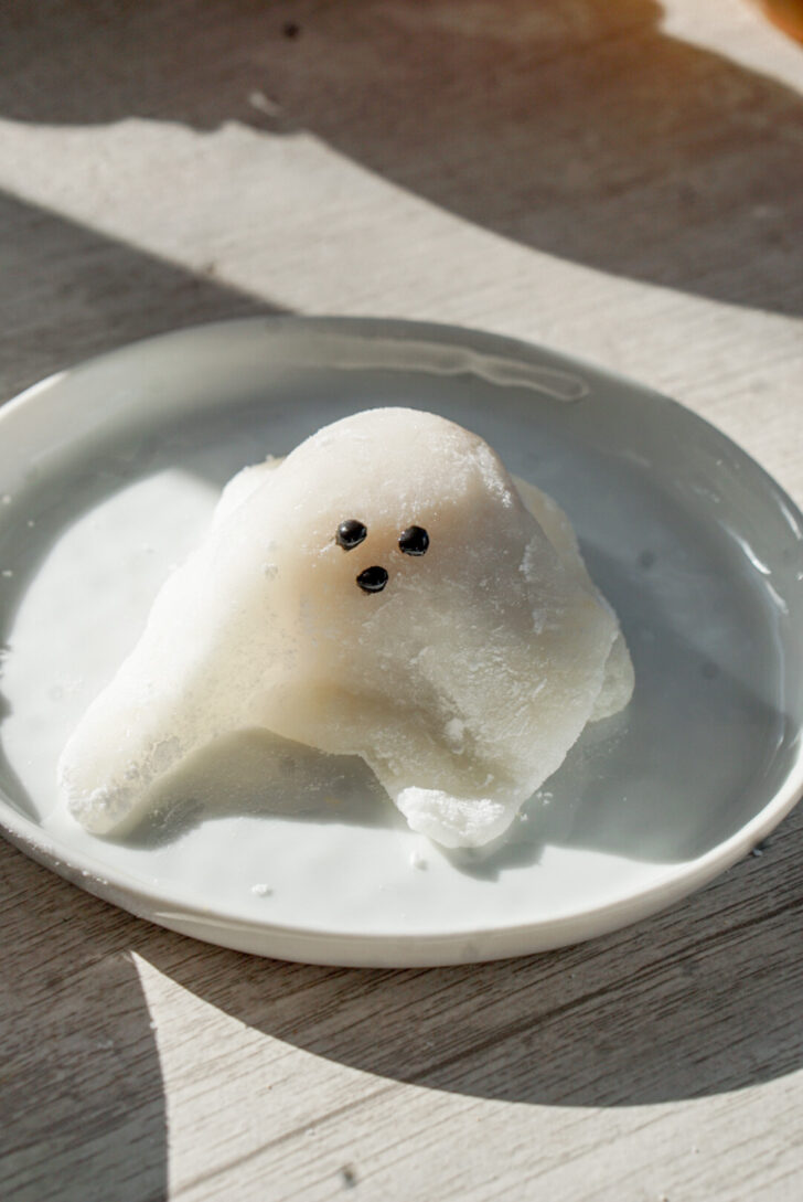 Normally to make daifuku, you wrap a hot gyuhi around a ball of filling, pinching the edges to form a sphere, similar to wrapping a round dumpling. Luckily, for this ghost version, we are emulating the look of a white bedsheet ghost. We donโt have to wrap the daifuku at all!