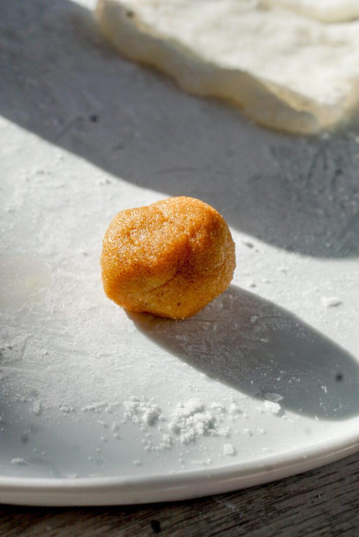 Please believe me when I say this recipe is so easy! The pumpkin filling is only powdered sugar, almond flour, and canned pumpkin puree flavored with a tiny bit of pumpkin pie spice. If you donโt have pumpkin pie spice, you can just substitute a little ground cinnamon plus a pinch of nutmeg or cloves or ground ginger or whatever you have lying in your cabinet. You donโt even need to cook the filling! It creates little pumpkin pie balls.