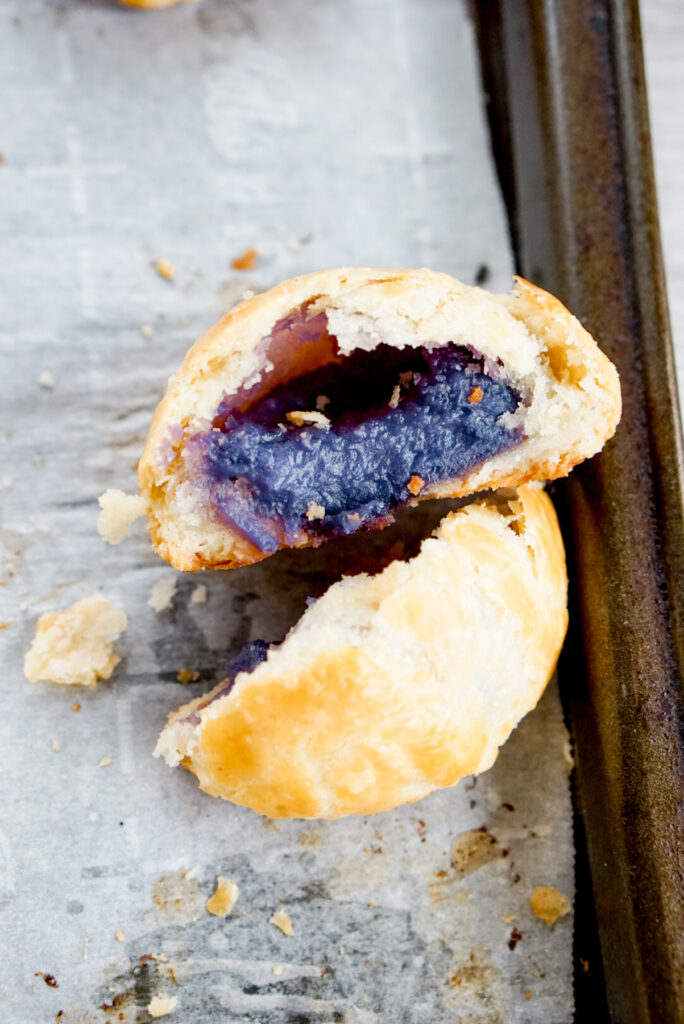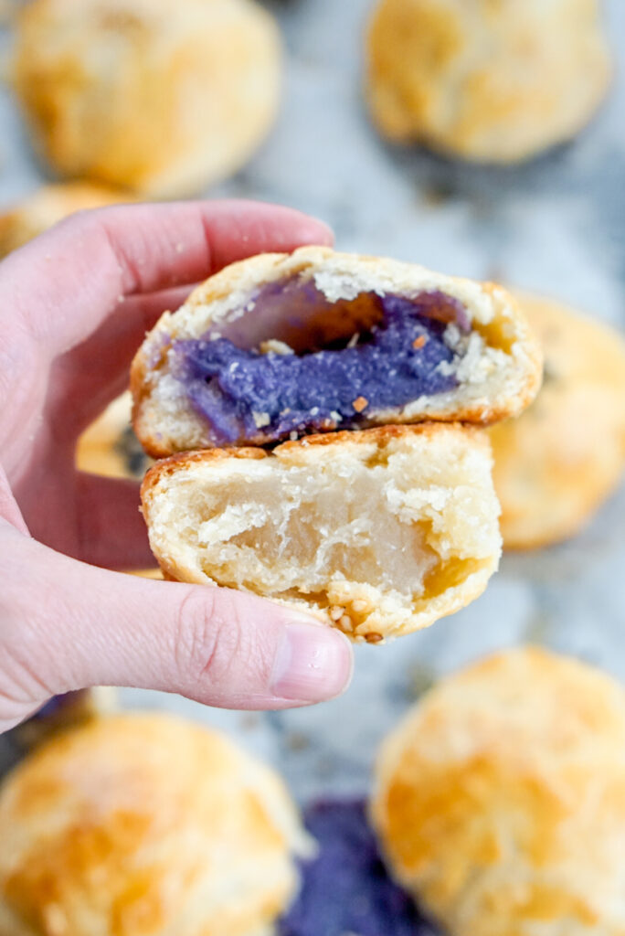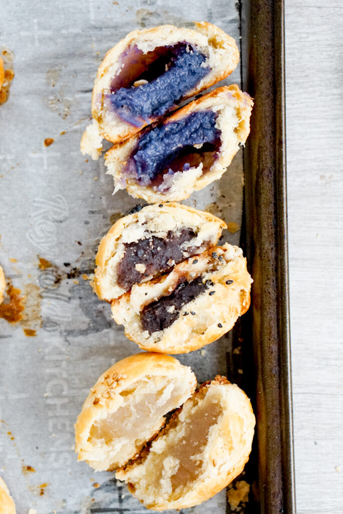 - The purple sweet potato filling you see in the photos is my homemade Okinawan sweet potato jam! It’s so good! It tastes like an Okinawan sweet potato haupia pie in a manju. However, if you really don’t want to make the jam, you could fill it just with mashed, cooked Okinawan sweet potato and a little sugar.
