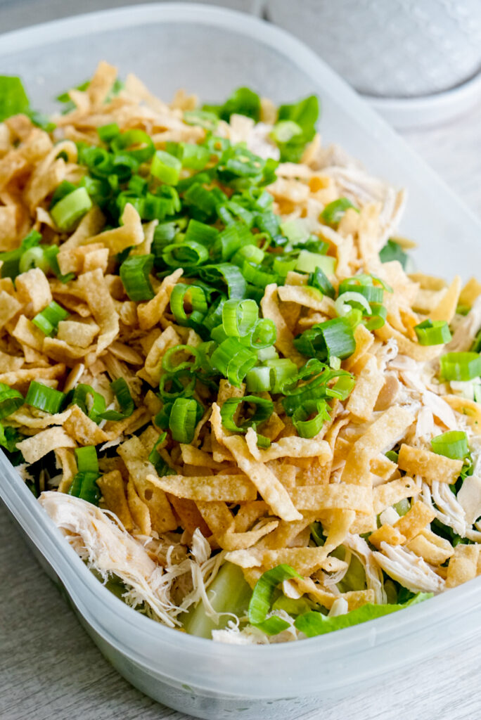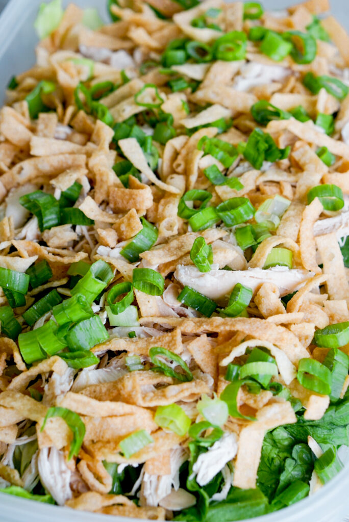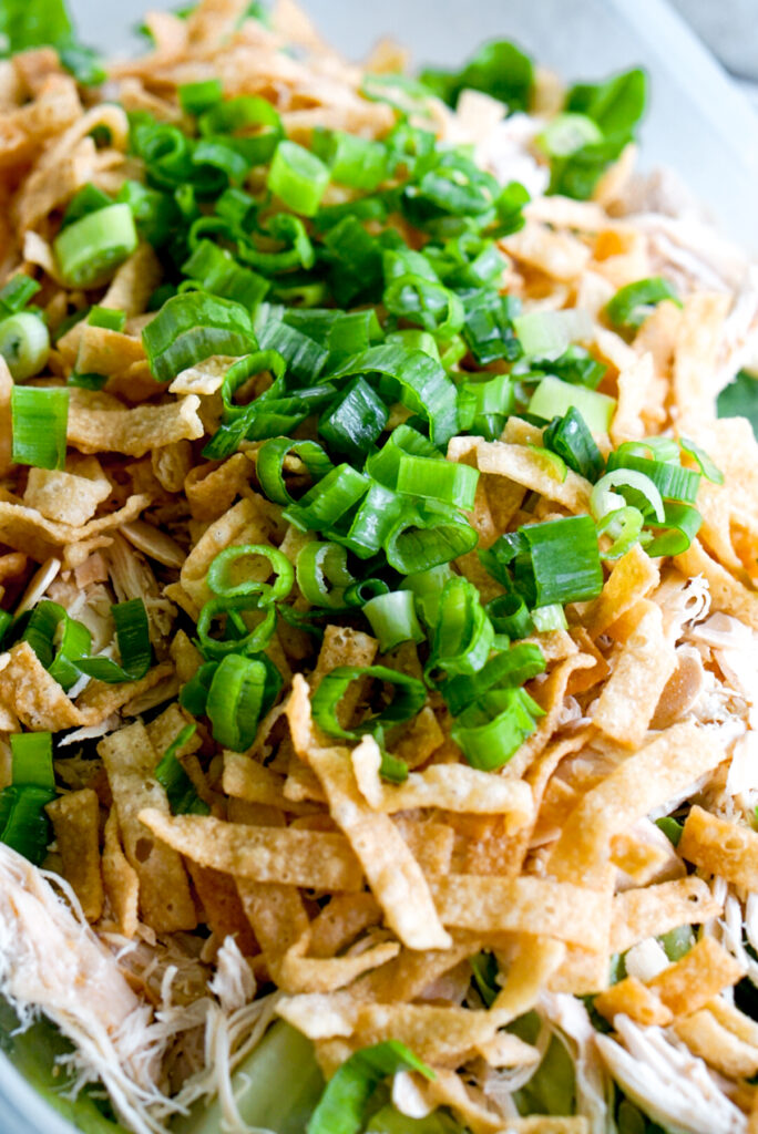 - Assemble: Layer lettuce, shredded chicken, wonton strips, and green onions. Add any additional toppings (e.g. cilantro, almonds, mandarin oranges) to taste.
