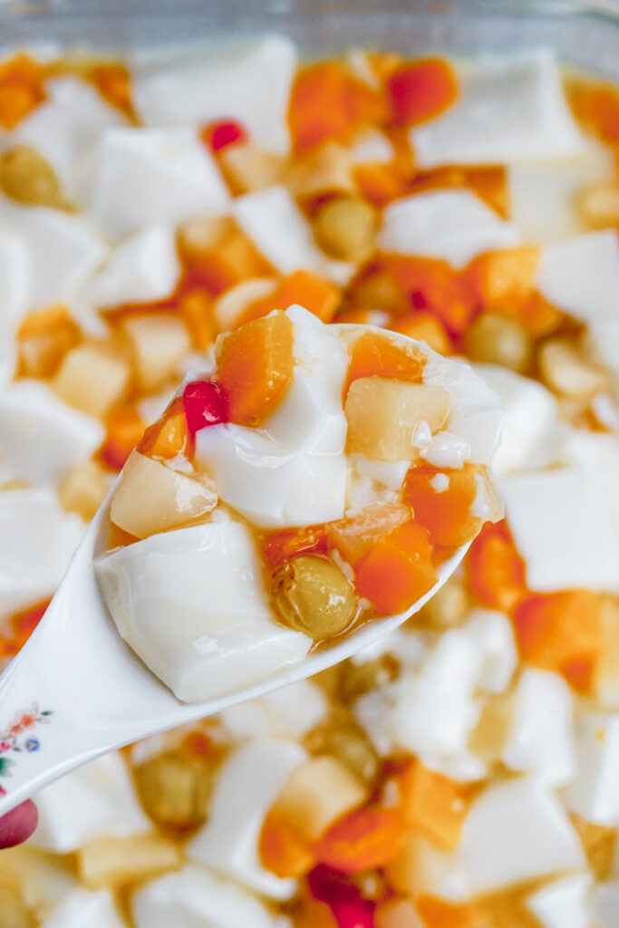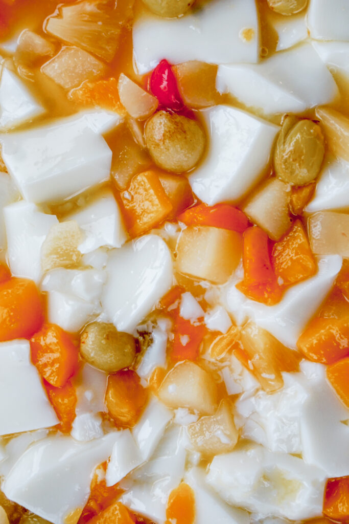 Traditionally, at least in Chinese American homes, almond jello goes with cans of fruit cocktail! Thatโs right, those syrupy, sweet, canned fruits from school cafeteria lunches are essential to almond jello. Despite the horrors of school cafeterias past, I do really love canned fruit cocktail in almond jello. If you have never bought fruit cocktail before, I usually buy the Del Monte brand, which looks like this, except I typically get either the lite syrup or the 100% juice to cut down on sweetness.