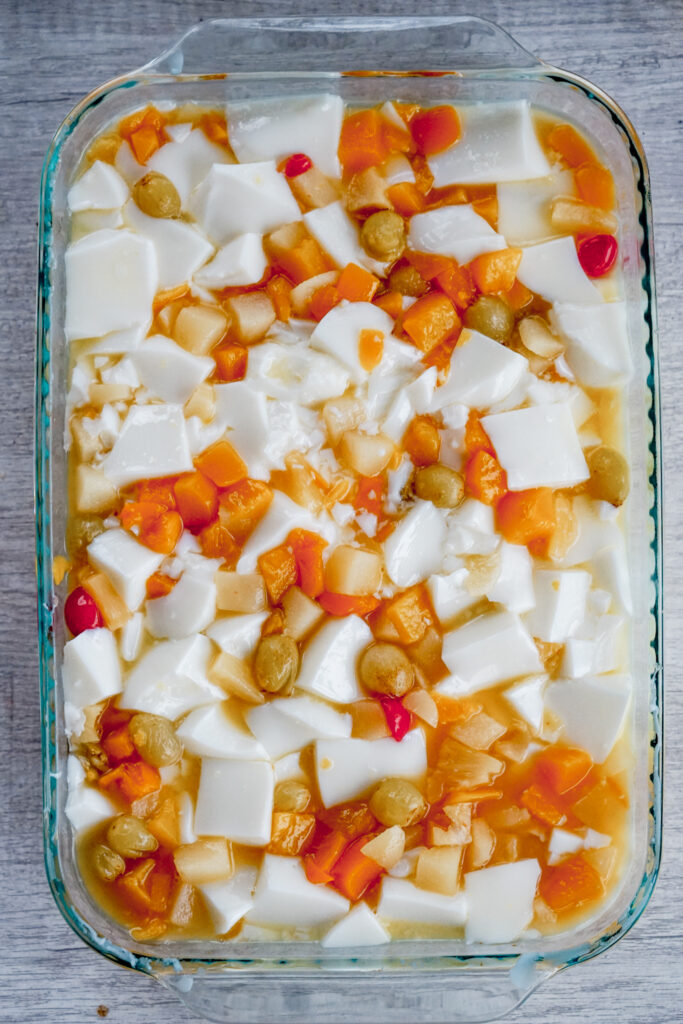 - When ready to serve, use a knife to slice your jello into cubes directly in the dish. Pour two cans of fruit cocktail directly over your jello cubes and stir to mix. Leftovers can be kept in an airtight container in the fridge.
