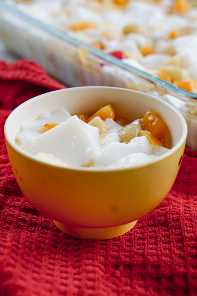 HOWEVER, I do acknowledge that some people may be too traumatized from past experiences with fruit cocktail to voluntarily use it in a dessert. I know some families use canned lychee instead or canned mandarins. You could also skip the cans altogether and cut fresh fruit yourself, youโd just miss out on some of the extra sweetness from syrup thatโs in the cans. In any case, you do you. Itโs hard to go wrong with fruit and jello.