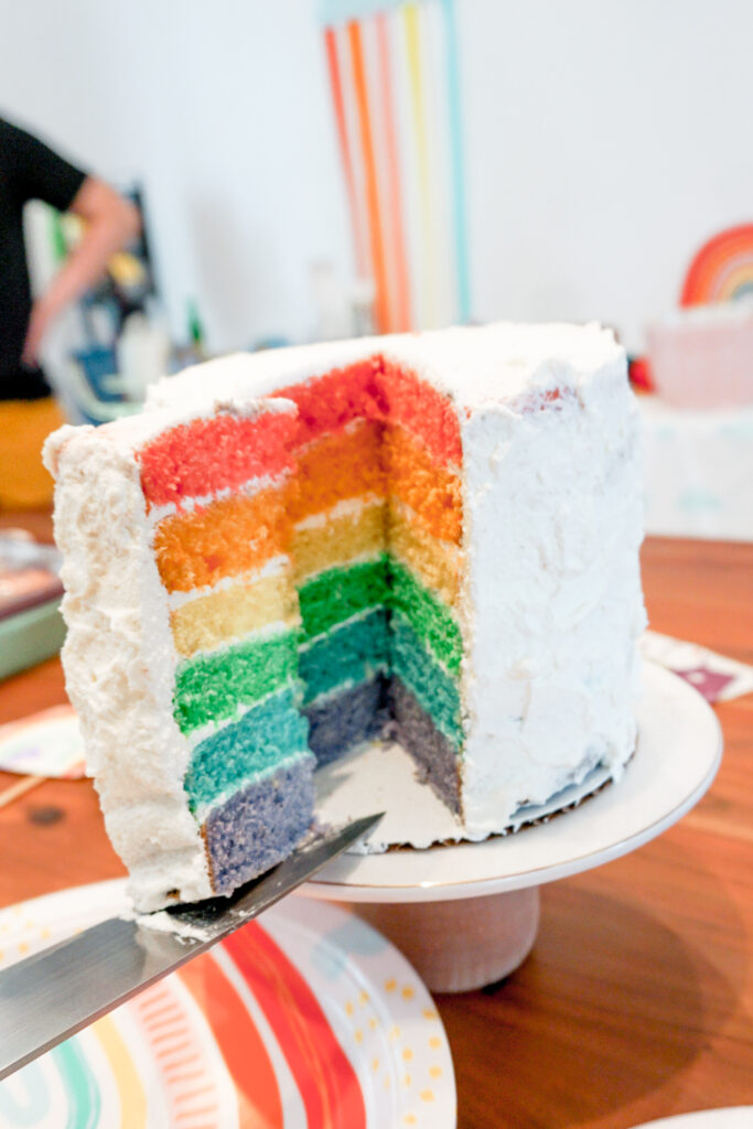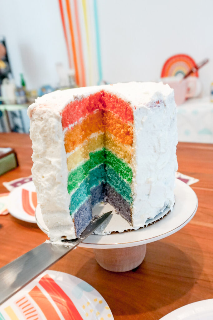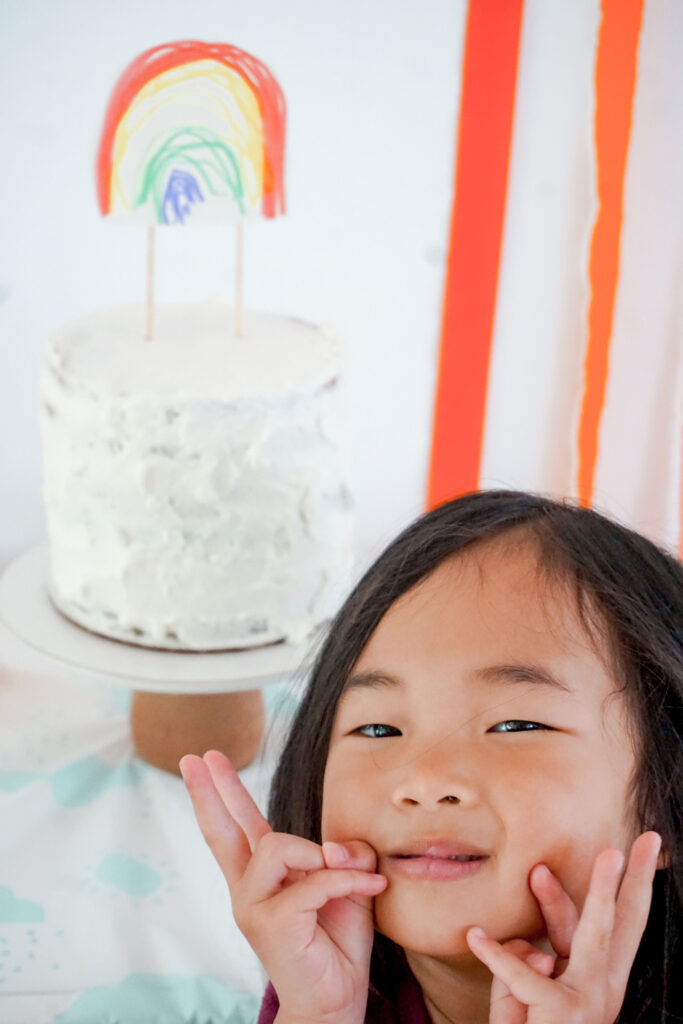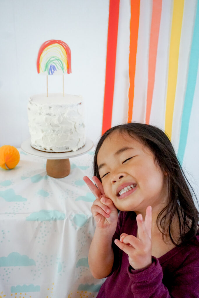 Um, hi! This post is literally a year late. I made this rainbow cake for my daughterโs fourth birthday, and sheโs now turning five. Oops!