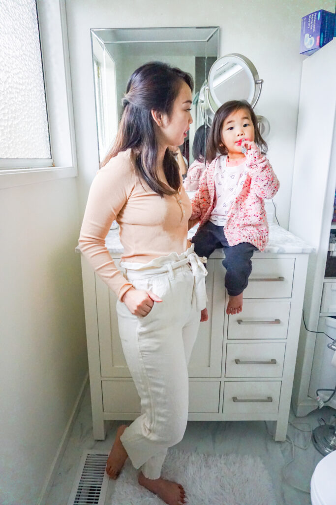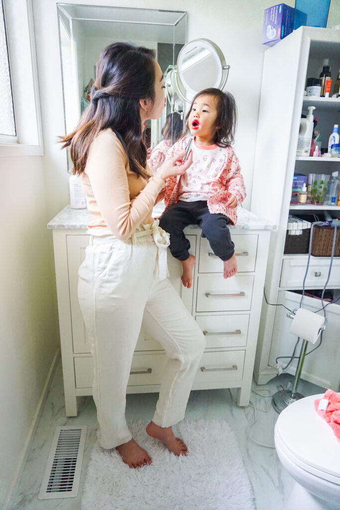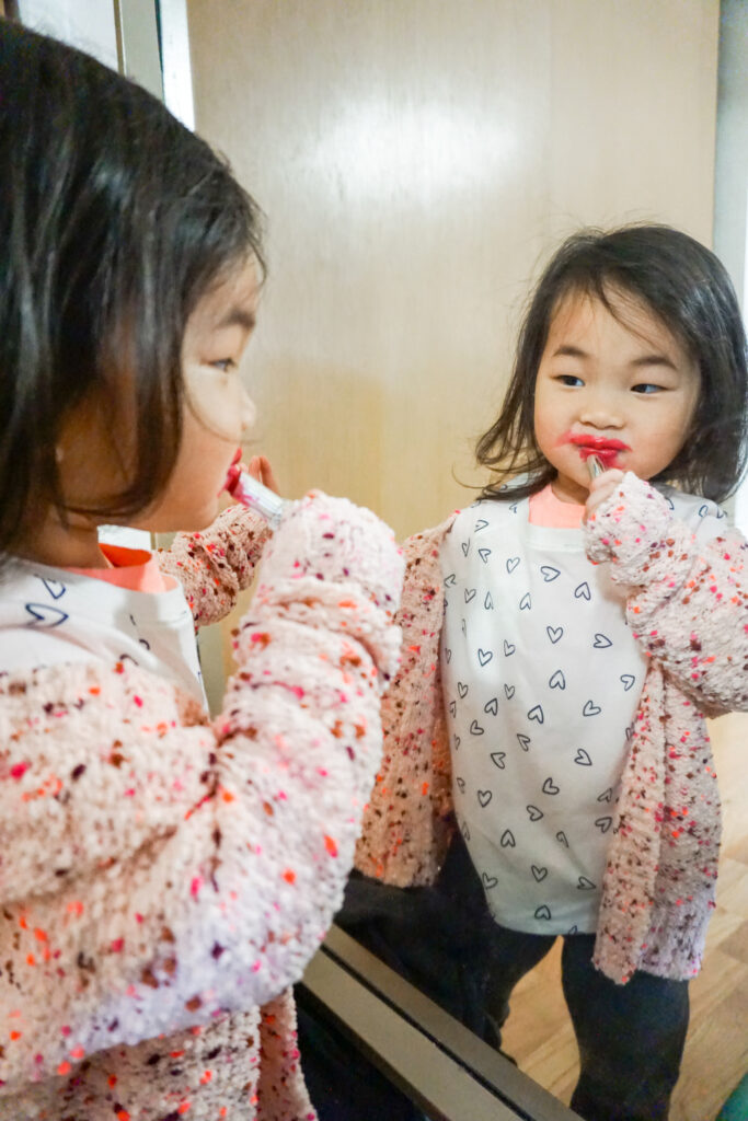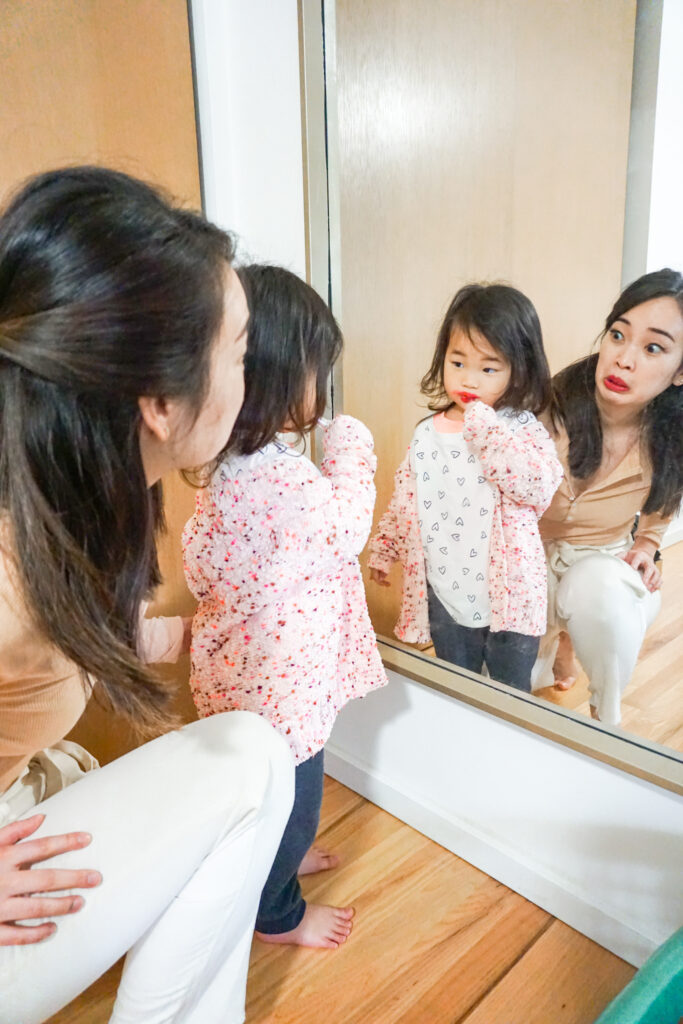 I saw some photos of toddlers doing a “playing with mommy’s makeup” pose. I thought it would be super cute for Jemma to get in on the trend.