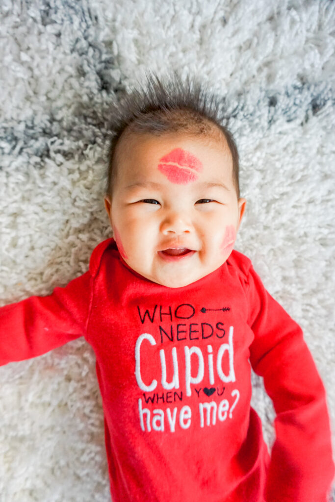 I was woefully unprepared for Valentine’s photos. Thankfully, I had a hand-me-down onesie from our good friend Elizabeth that fit Juliet perfectly. I layered on some shiny lipstick and gave her a couple smooches. Perfect photo op!