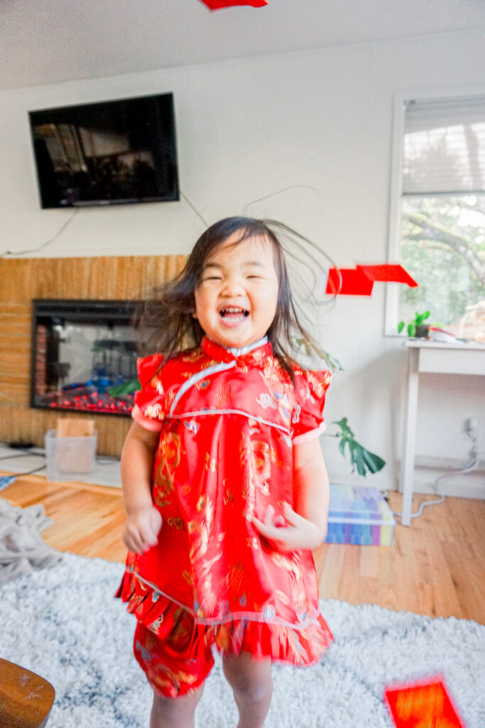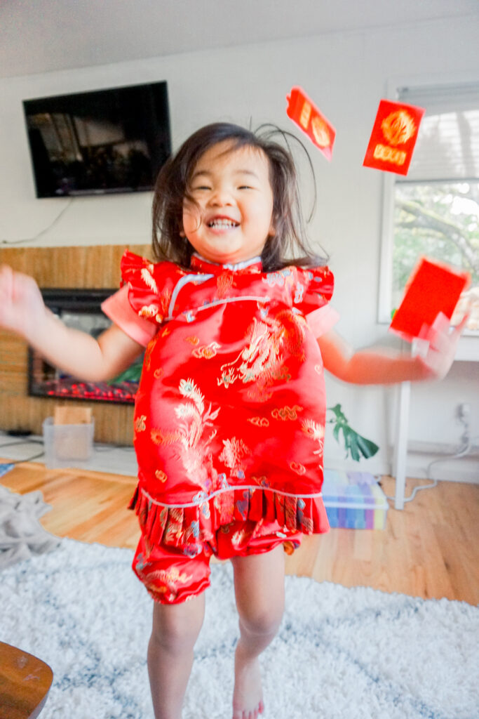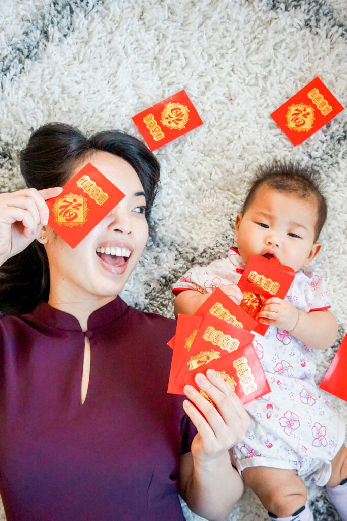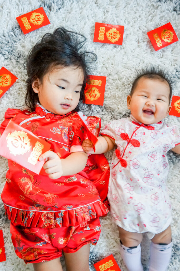 Don’t forget to wear your cheongsam! Mine is a jumpsuit that I got from Singapore, but the kids’ are from Amazon. You can find Juliet’s onesie here and Jemma’s here.