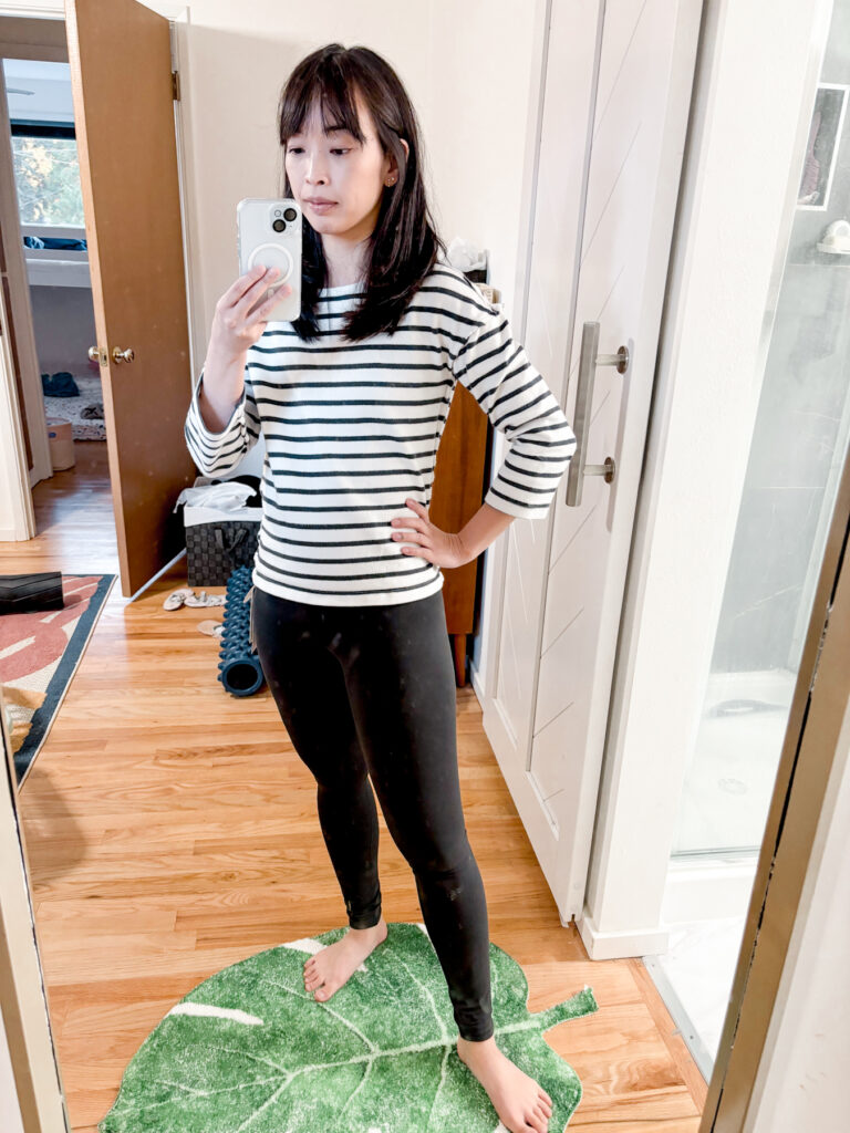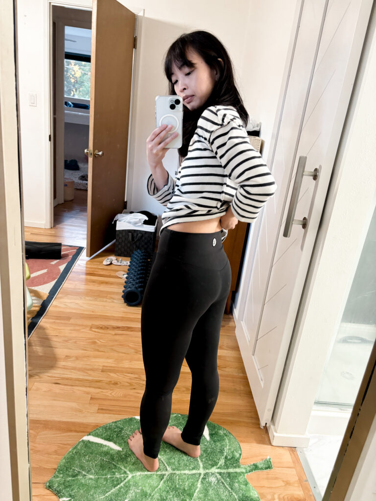 The Vuori leggings came in second. The length and design was right, but I wanted a more natural fabric feel and didnโt love the weird logo patch on the back. However, I would definitely still reach for these in my closet if my other leggings were in the laundry, so not a bad buy.