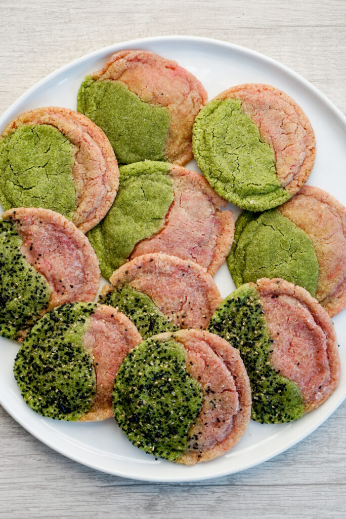To get the pink color, I use a combination of freeze dried strawberries blended into a powder and pink food coloring, as I find the strawberries alone aren’t strong enough. Alternatively for both the matcha and the strawberry, you can use only food coloring instead. You won’t get the fun flavor contrast, but you can still get a delicious sugar cookie. I would add a tsp of vanilla extract in that case.
