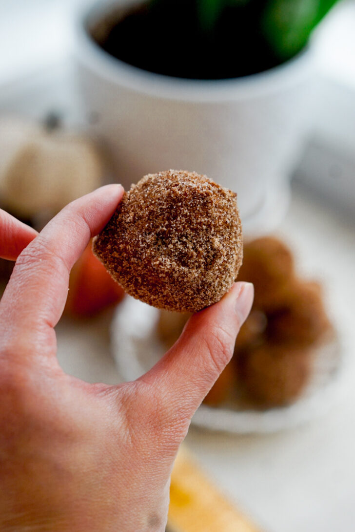 - Remove donuts to a wire rack and when cool enough to touch, dunk in a bowl with extra cinnamon and sugar to coat.