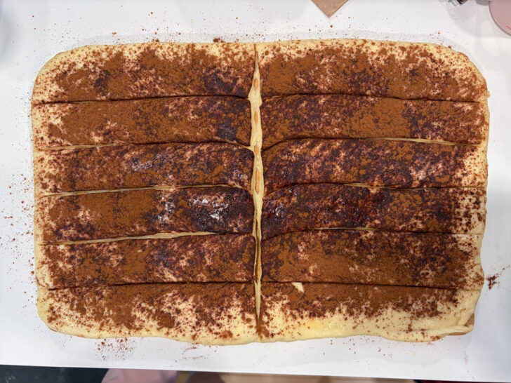 Instead, I find I get really nice spirals when I slice the dough down the middle and then into 12 equal strips (6 on the left, 6 on the right). The strips are about 1.5 inches by 6 inches. Then, I roll each individual strip into a cinnamon roll. They look so much neater than when I try to slice a soft log of dough! Iโve heard of using floss to slice the logs of dough, but that seems like more fuss than Iโd like.