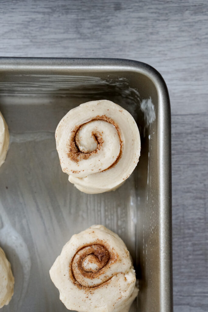 - Lay the cinnamon roll pieces flat in a greased 9ร13" baking dish, leaving space between each piece for the next rise.