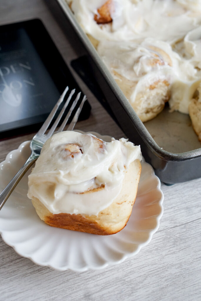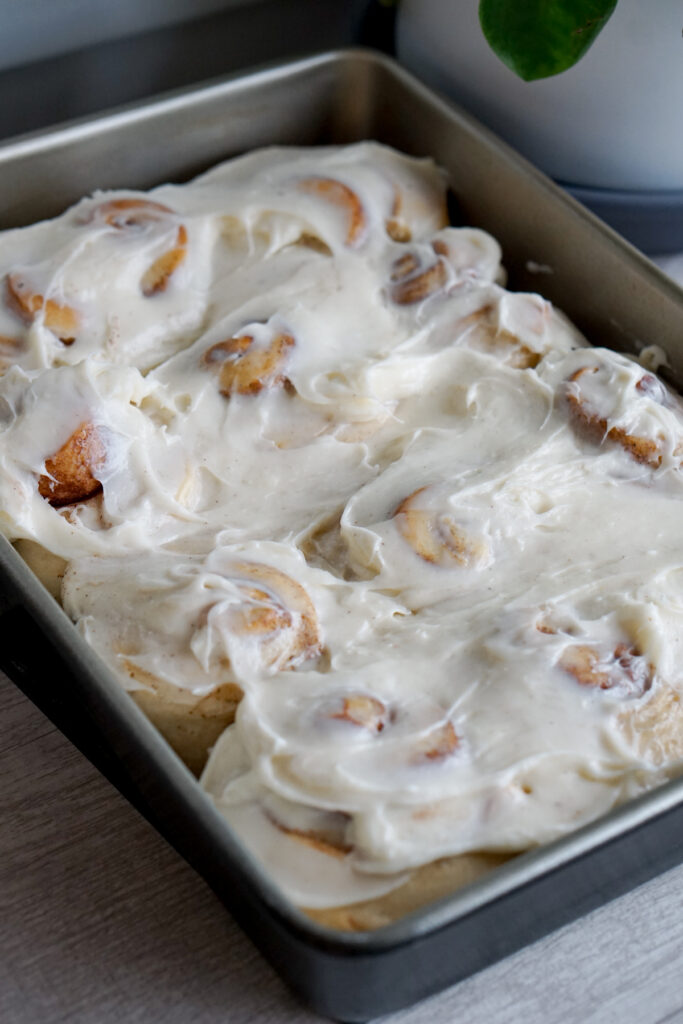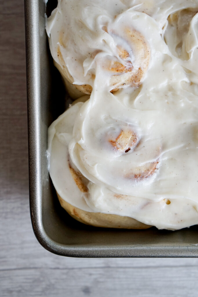 The cream cheese frosting (using 4oz of cream cheese) is about half what I usually make to frost a dozen cupcakes. Itโll be just enough to cover your tray of cinnamon rolls. But if you are a huge frosting fan, I recommend you double the amount. Maybe have a little extra frosting on the side of each roll?