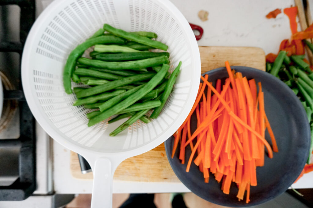 Place green beans and carrots in a microwave safe bowl with about 2 tbsp of water. Cover and microwave 3 minutes to steam. (Alternatively you can bring a pot of water to boil and blanch the veggies for 1 minute).- Run veggies through cold water to cool them down enough to handle.