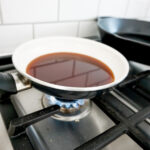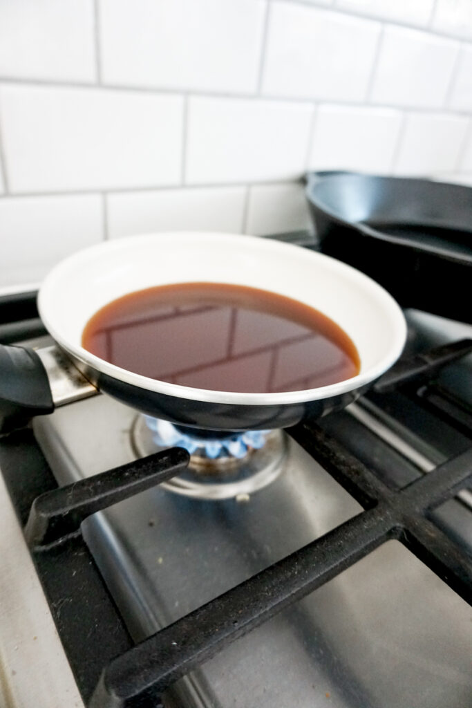 - In a skillet on stovetop, mix sugar, soy sauce, mirin, and sake.