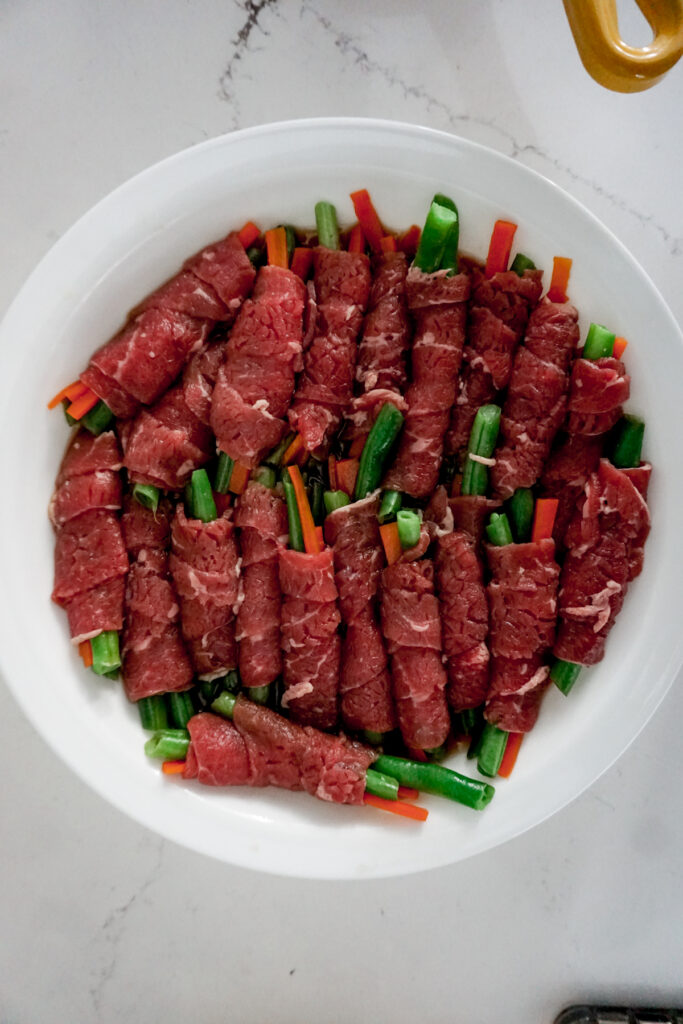 - Take a thin slice of beef and place two green beans and a few matchstick carrots at one end. Roll the vegetables in the beef, covering the length of the vegetables.
