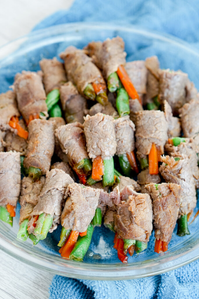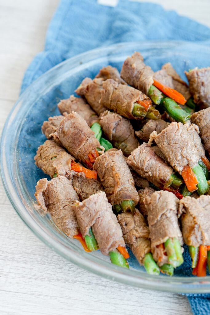 You can use pretty much any vegetables you want. I always use green beans and carrots because thatโs what my grandma did, so now it has nostalgia for me. I was a very picky eater as a kid (can you believe it?), but I ALWAYS ate my green beans and carrots when they were rolled up in teriyaki beef. Go figure.