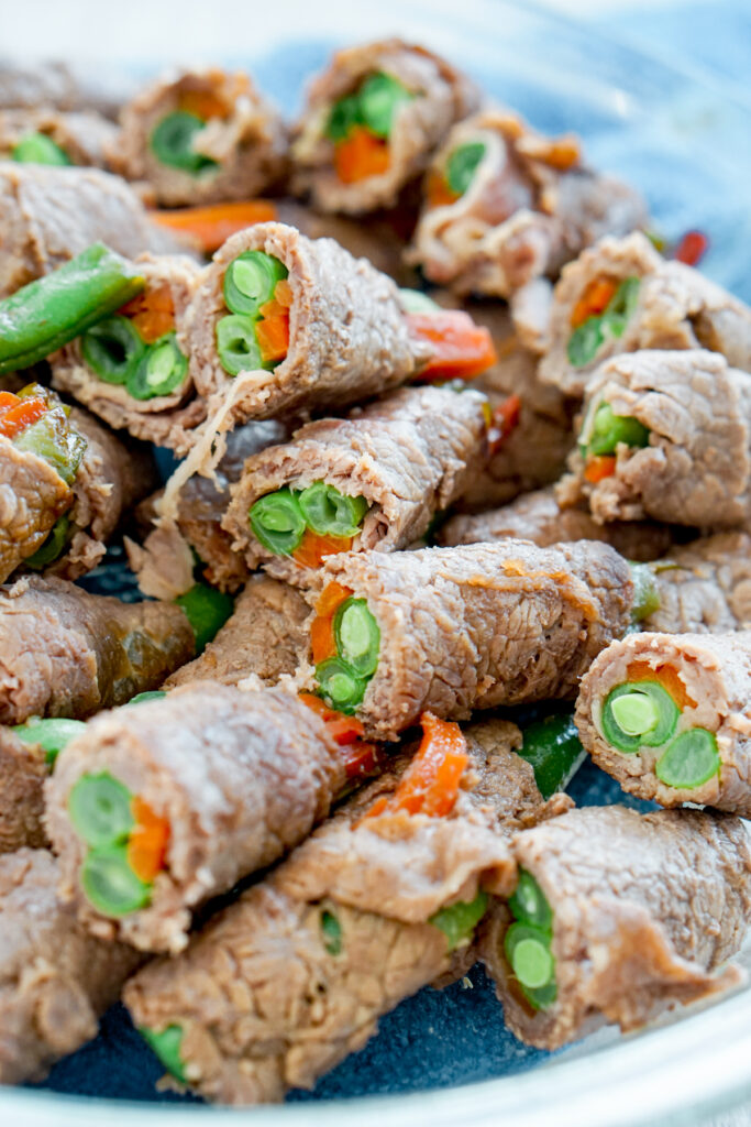 If using the marinade the night before, be sure to let it cool before actually putting it on the raw meat. I like to roll my beef and veggies first, then marinate them, turning them once halfway into their marinating time. But you could definitely marinate the meat first and then roll them up.