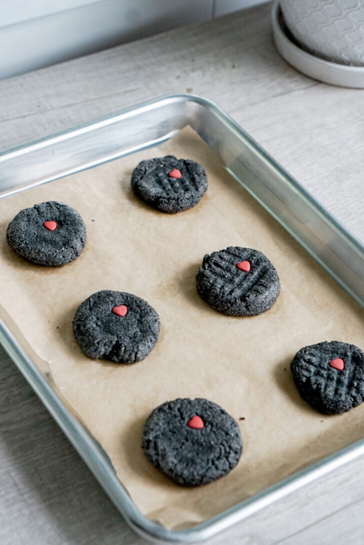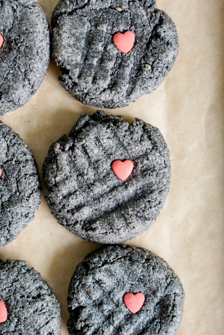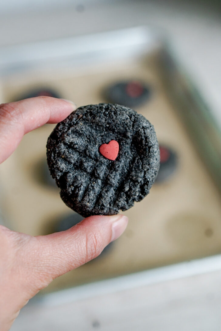 Want to make “Tin Man” cookies for a Wicked movie night? Or a Wizard of Oz party? These are perfect! They’re naturally gray with no artificial colorings or flavors (I don’t like to add any vanilla extract so it doesn’t take away from the black sesame flavor). Simply press a single heart sprinkle onto each cookie before it bakes. That’s it. Tada! So easy.