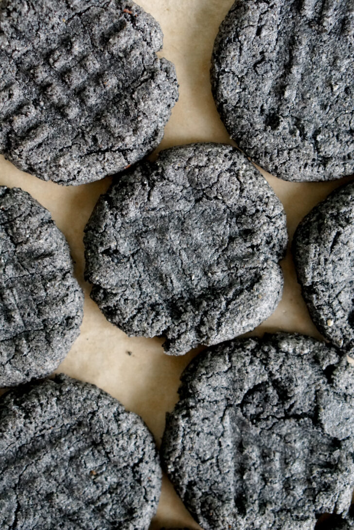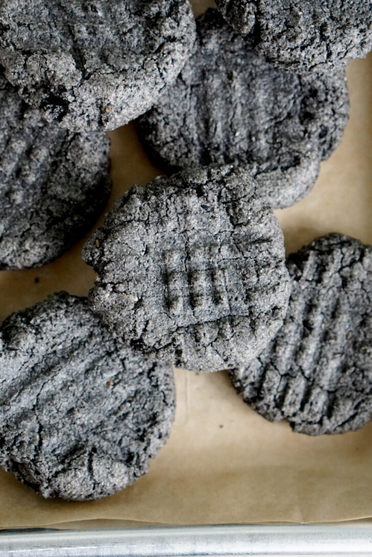 If you’d like to achieve a typical cookie appearance, you’ll need to flatten these cookies yourself. You can use a mason jar or even your fingers to flatten the black sesame cookie balls either before baking or while they are hot, straight out of the oven. If you want, you could press a fork into the cookies to create a crosshatch pattern, like the common design for peanut butter cookies.