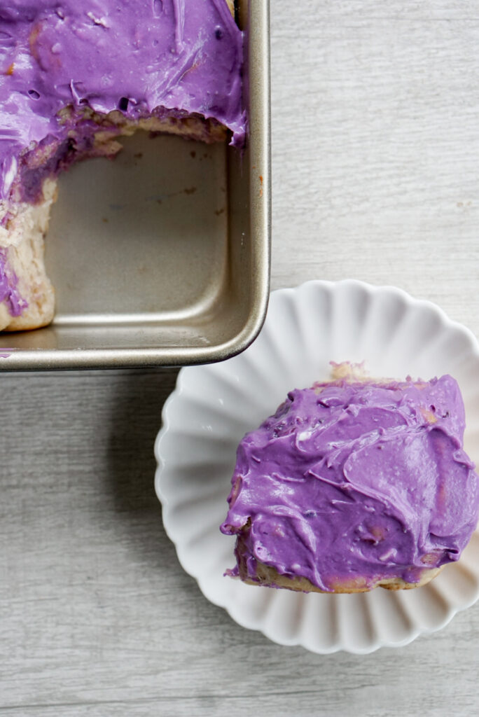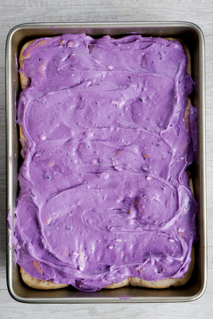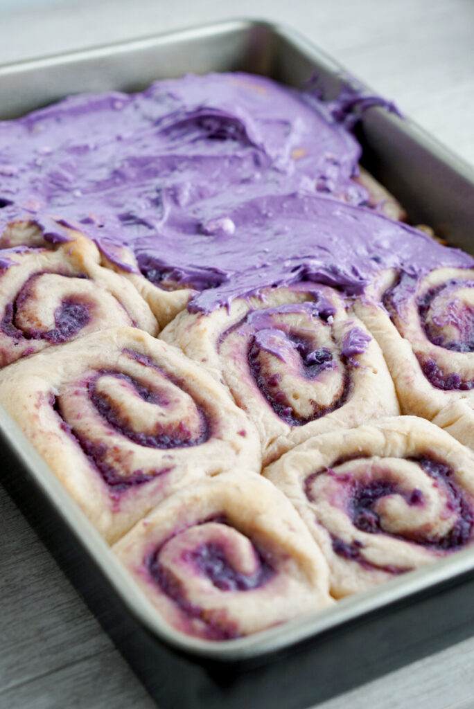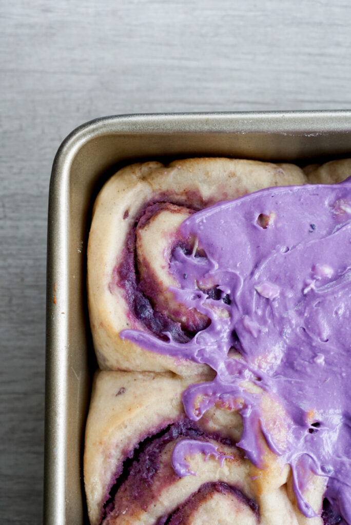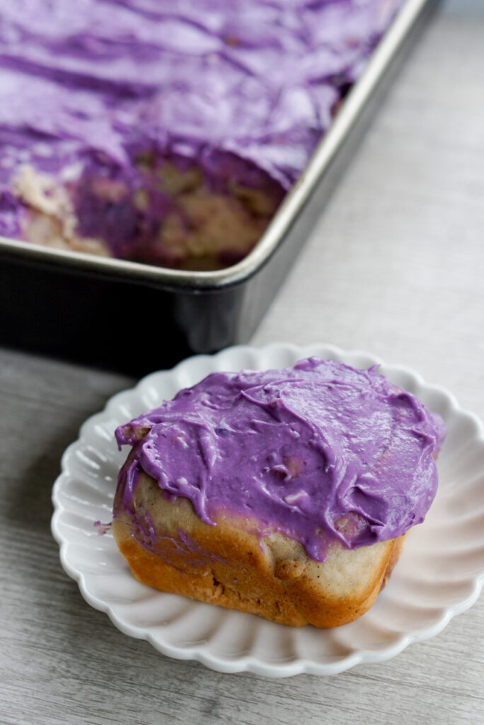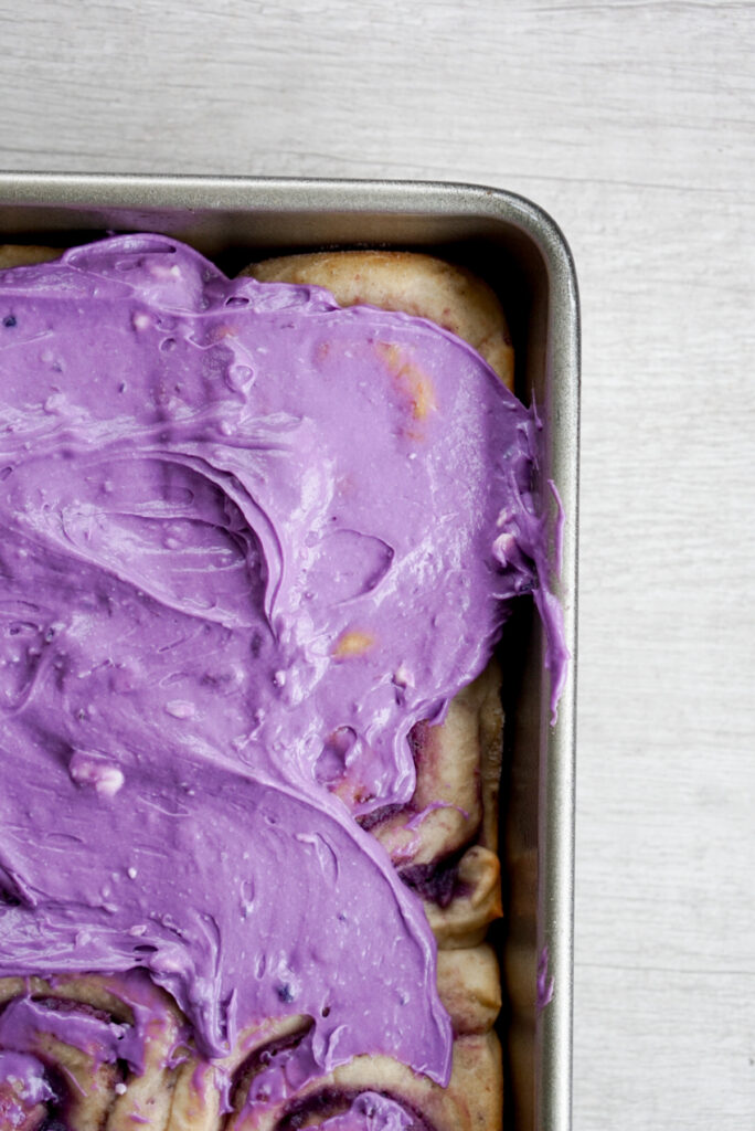 I am solidly on team cream cheese frosting when it comes to cinnamon rolls. However, I found that it was really hard to get a purple color and sweet potato flavor naturally. The cream cheese flavor is just too strong!ย