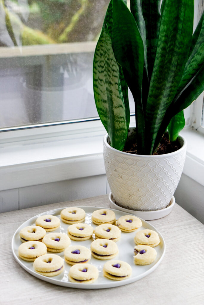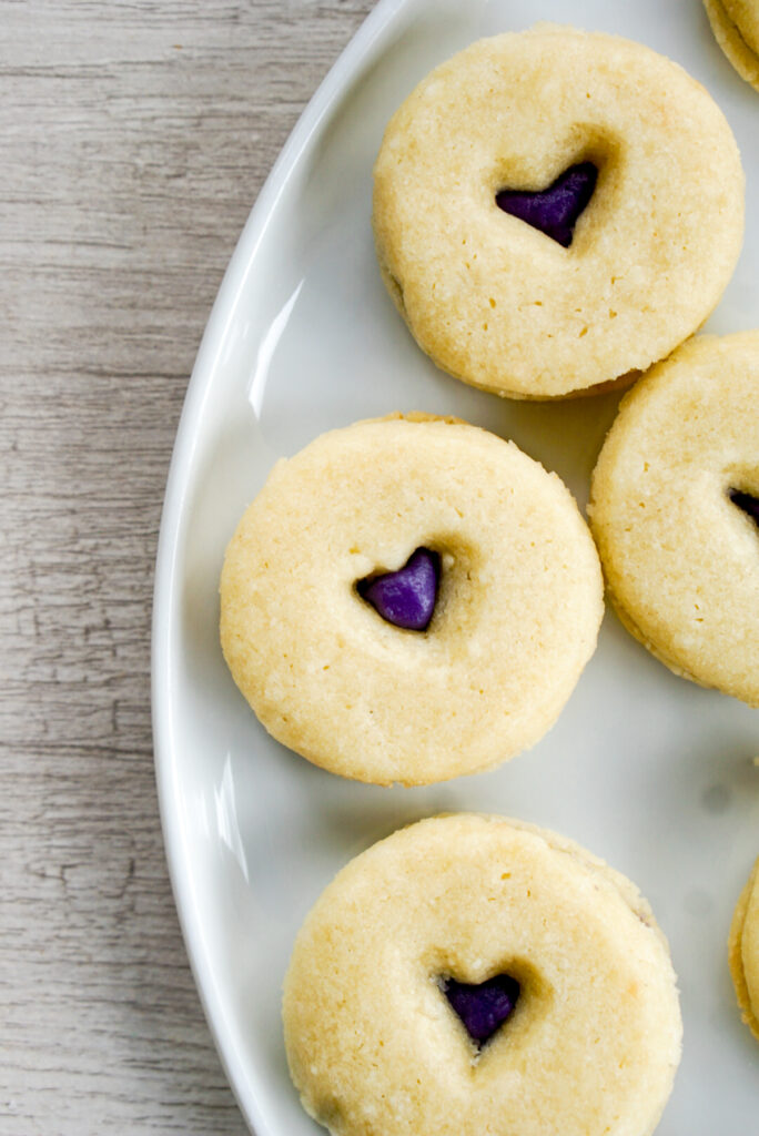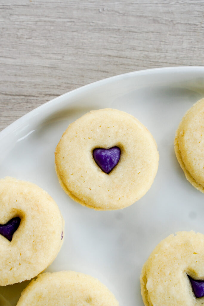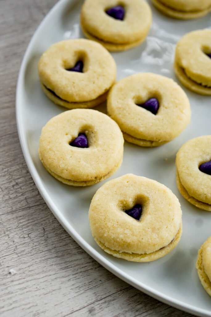 For now, enjoy this recipe for Asian-ish linzer cookies! Linzer cookies are sandwich cookies that have a design cut out of the front. Sometimes you find them stamped with patterns and dusted in powdered sugar. The most common iteration is with a red jam in the middle, which you might see frequently around Christmas. This purple sweet potato version, however, is great year round!