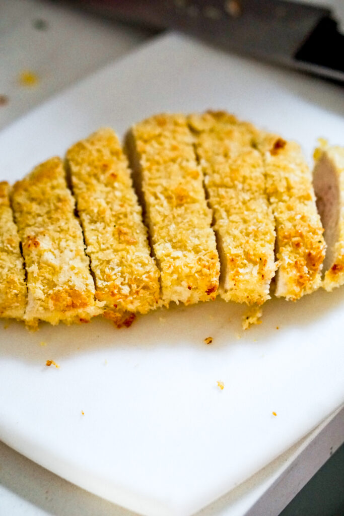Chicken katsu is deep fried, panko crusted chicken breast. The chicken is usually thinly sliced and tenderized before breading in Japanese breadcrumbs (panko) and frying. You usually see chicken katsu sliced into strips and served with rice in a bento. In America, itโs most common to find katsu at teriyaki joints.