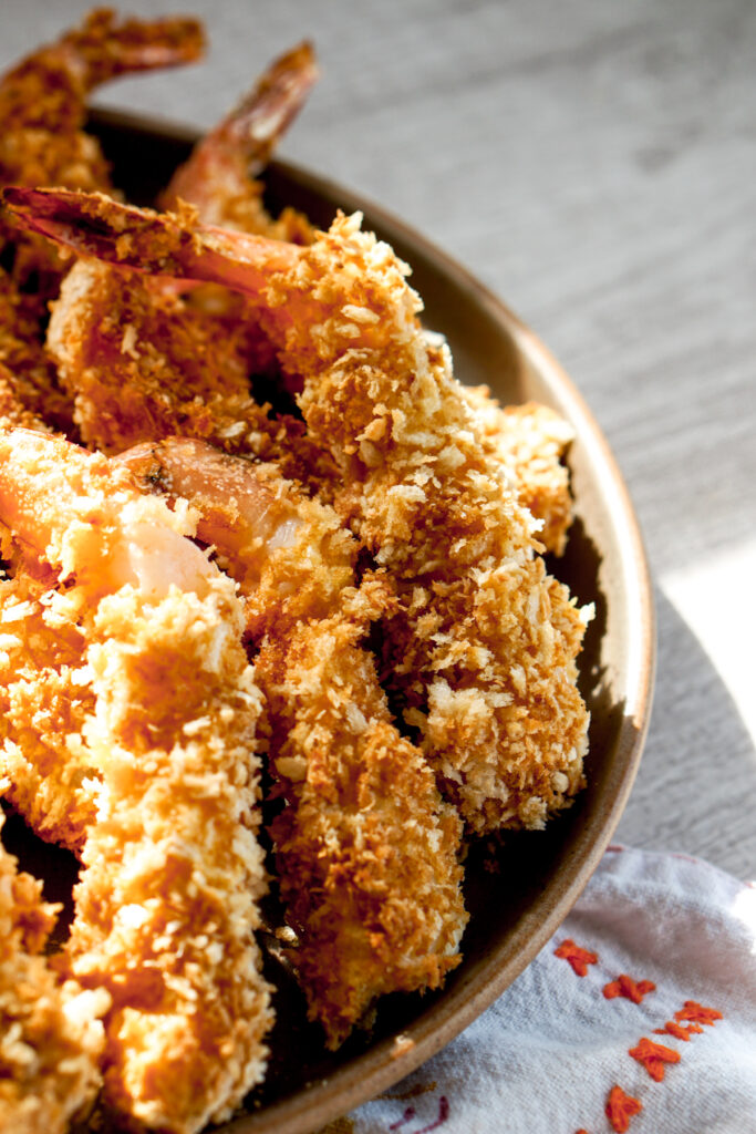 - Bread the shrimp by dredging it in your egg+flour batter and then dipping in your toasted panko, being sure to press the panko firmly into the shrimp.