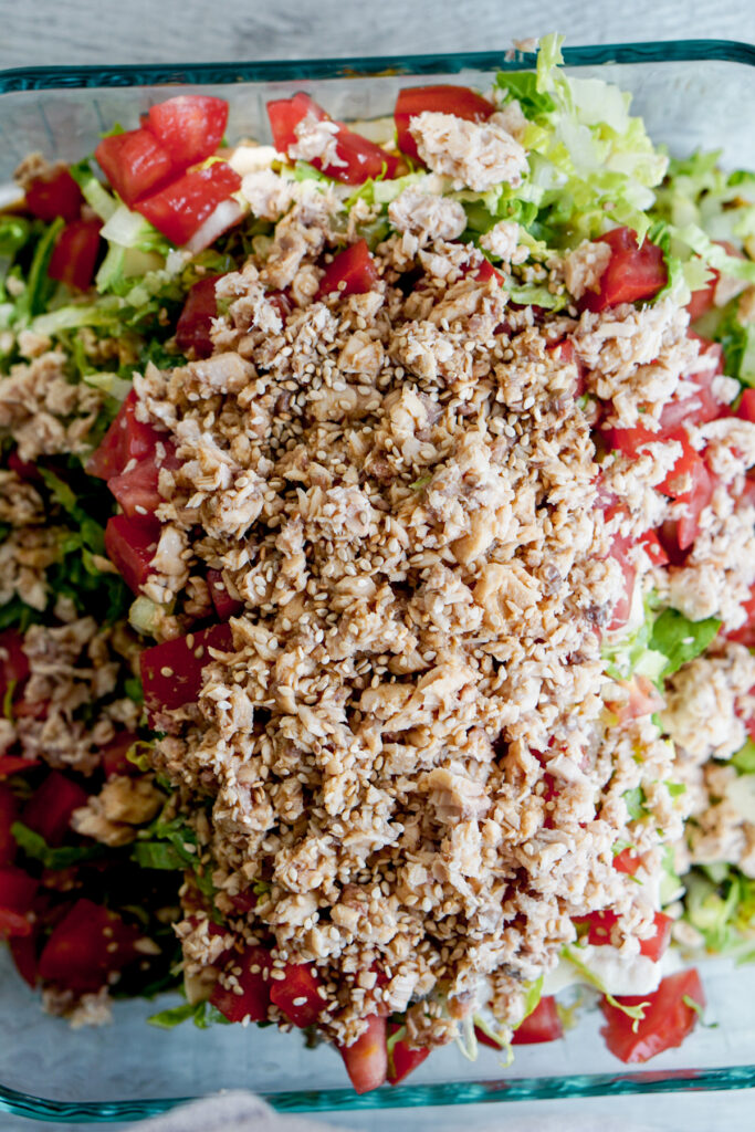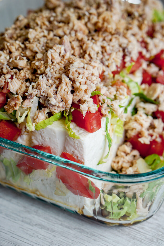 All you have to do is layer tofu with shredded lettuce, chopped tomato, canned salmon, and dress with sesame oil and soy sauce. Sprinkle green onions and sesame seeds, and youโre done! I ran out of green onions the day I took photos (I know.. bad Asian), so you wonโt see them here. But you should definitely add them. Do as I say, not as I do.