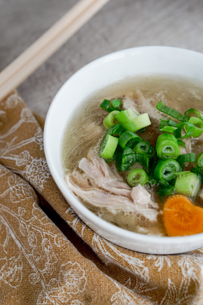 My recipe for chicken long rice comes from an old Japanese church cookbook. When I first started cooking my own chicken long rice, this is the recipe I started with. It has a lot of gingery broth, making it like a cozy, comforting chicken noodle soup with Asian flavors.