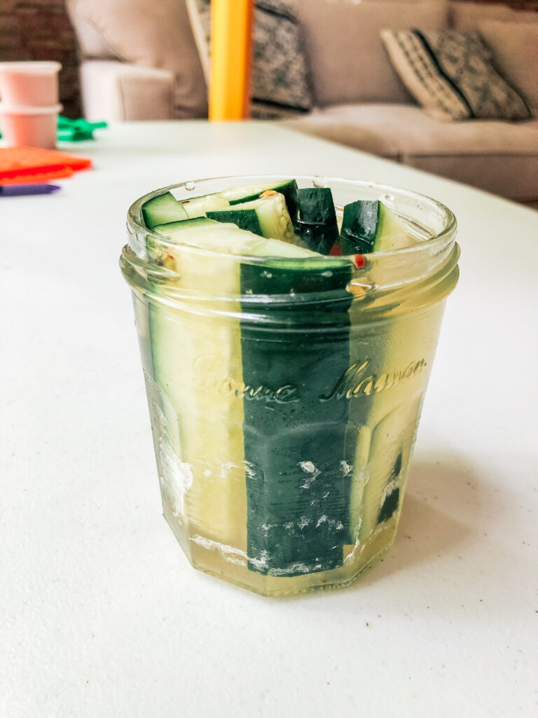 - Pour pickling liquid over veggies, seal, and refrigerate for at least 30 minutes. Leftover vegetables can be kept in the liquid in the fridge.