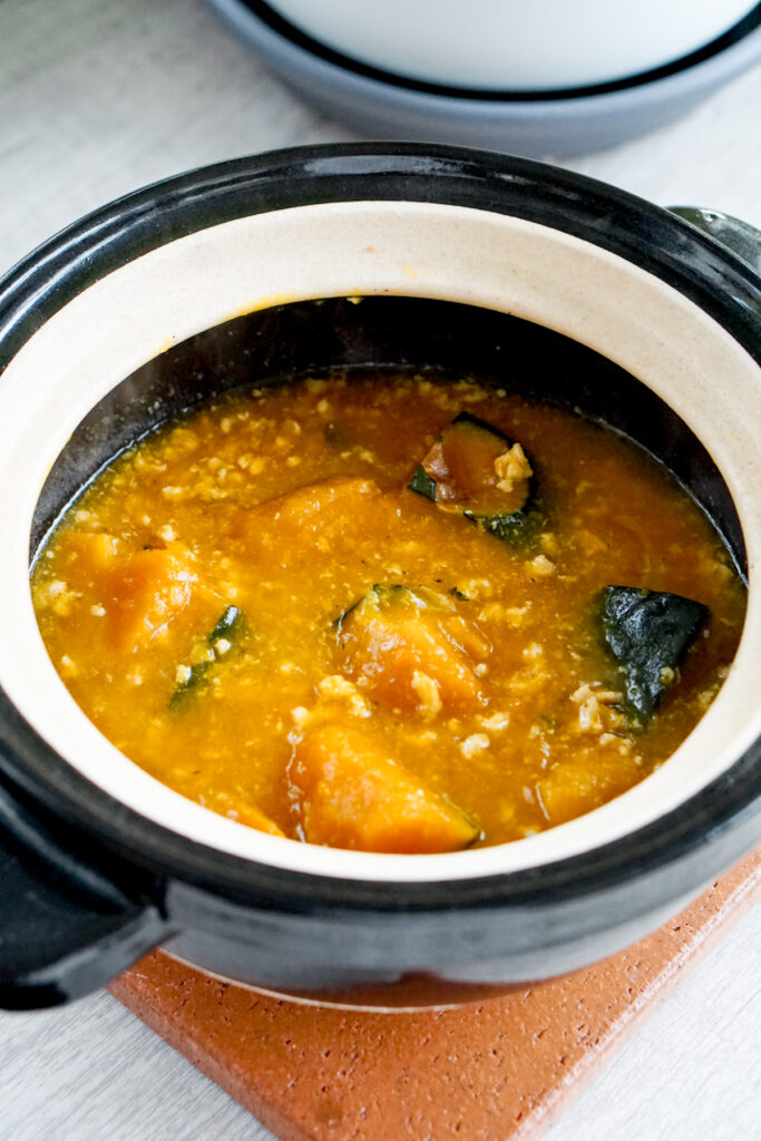 If you’re using frozen kabocha that’s precut, cooking kabocha is so easy. Just stick it directly into the pot with seasoning liquid and cook for about 10 minutes.