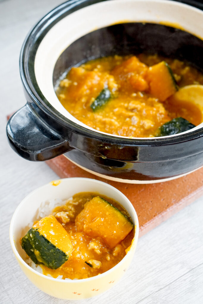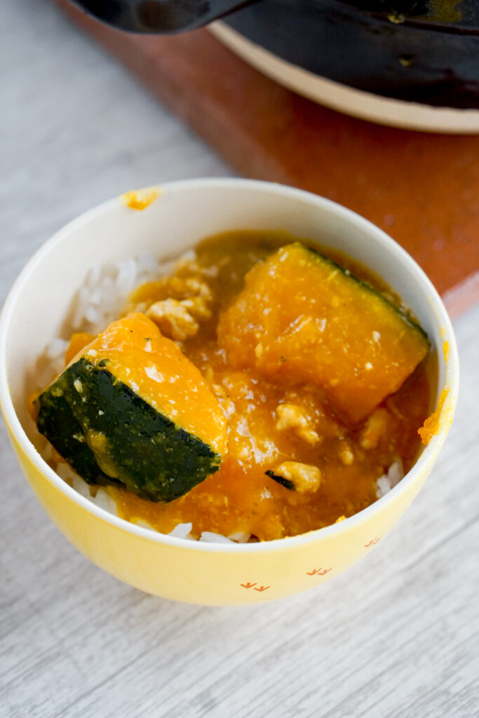 Kabocha is a super common ingredient in Japanese dishes in the fall! There’s a very popular kabocha dish called kabocha no nimono, which is a simmered kabocha in seasoned broth. In fact, this kabocha soboroni is a version of kabocha no nimono, except in this recipe, ground meat is added and the seasoning broth gets thickened to become like a stew.