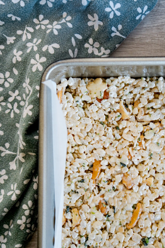 - Press into a greased 9ร13" baking pan or tray. I recommend lining the pan with parchment paper to easily lift up the treats and slice them later, or they can be cut and served directly from the pan.