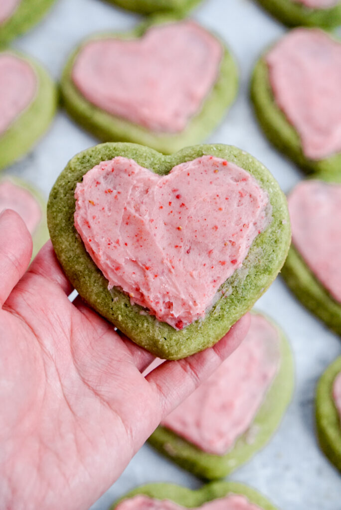 I love the taste of these cookies by itself, but because it’s so soft and cake-like, I also really loved it with frosting! The frosting I recommend for these cookies are a typical American buttercream recipe. For strawberry flavor, I added 1/2 cup of freeze dried strawberries that I blended into powder. I actually think this recipe would taste AMAZING with just almond buttercream as well, but my kids are strawberry monsters. For almond buttercream, simply omit the strawberries and add 1/4 tsp of almond extract. Less is more when it comes to almond extract, trust me.