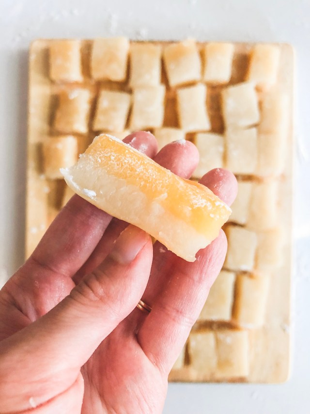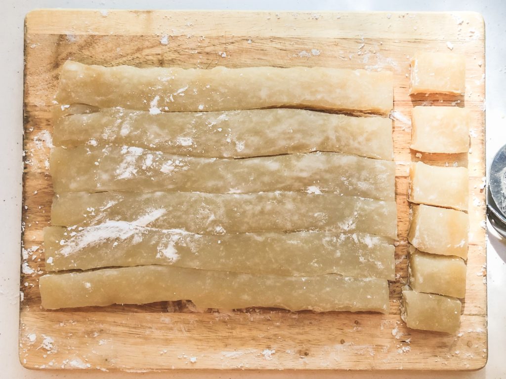 - Use a plastic knife or pizza cutter to slice your mochi. Again, it prevents sticking.