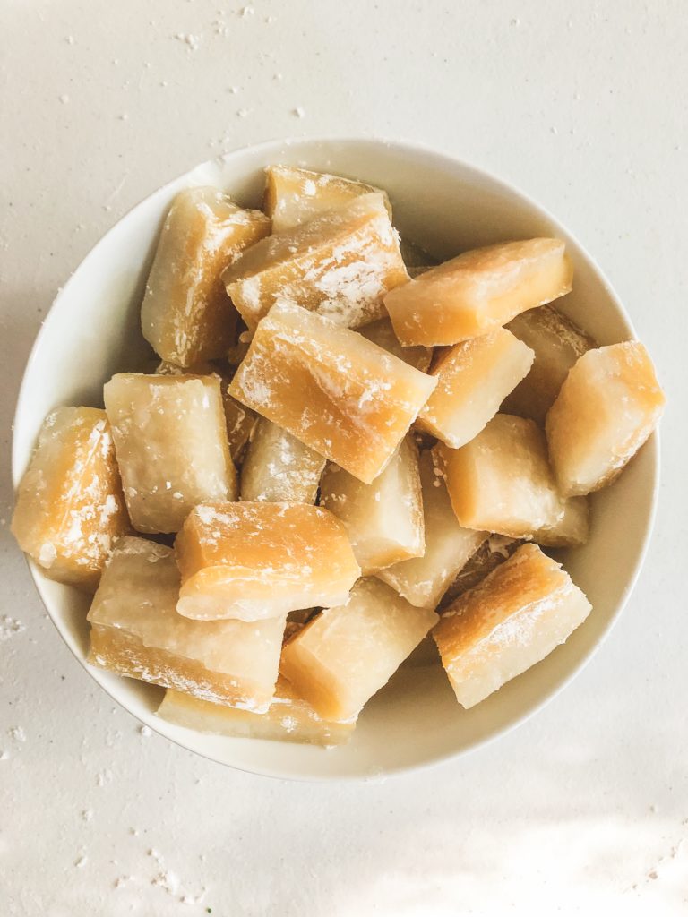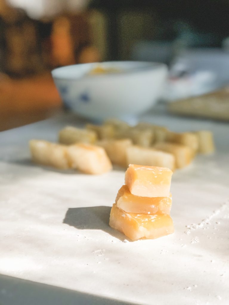 I talked about this initially in my coconut rose chi chi dango post, but chi chi dango refers to a mochi dessert thatโs commonly found in Hawaii. Originally from Hiroshima, chi chi dango is not well known in Japan. The Hiroshima version used cowโs milk, but when immigrants to Hawaii brought over chi chi dango, they adapted to local ingredients and began using coconut milk instead. So the Hawaii chi chi dango is made with mochiko, aka glutinous rice flour, sugar, and coconut milk with a little water to form a sweet rice cake. If youโve ever made microwave mochi, youโve made chi chi dango. Iโve been trying to stay away from using too much plastic in the microwave, so I make my mochi in the oven instead.