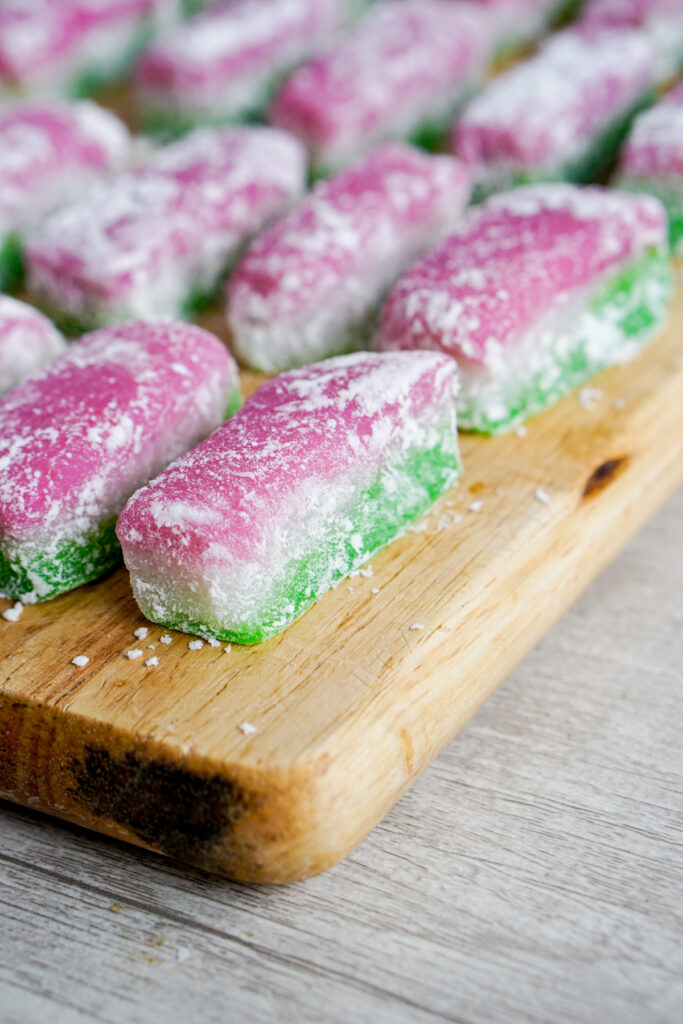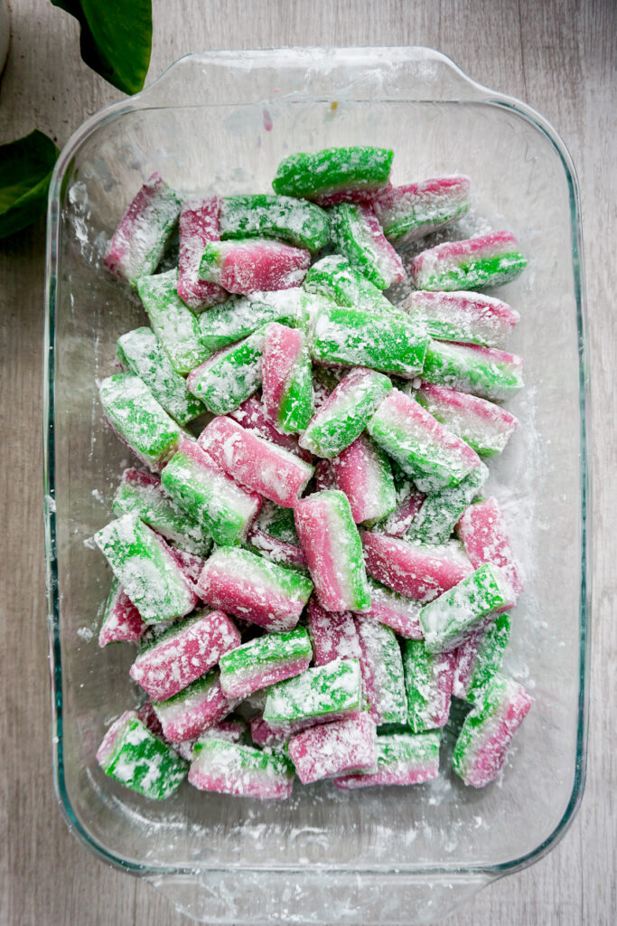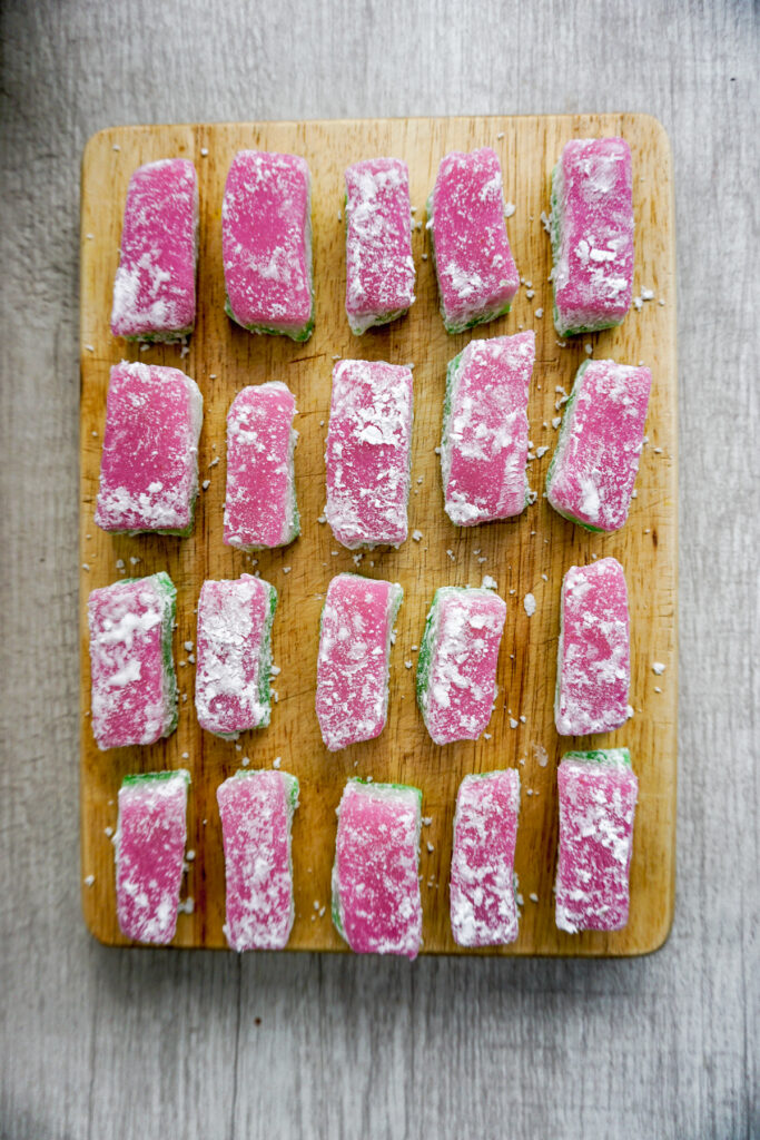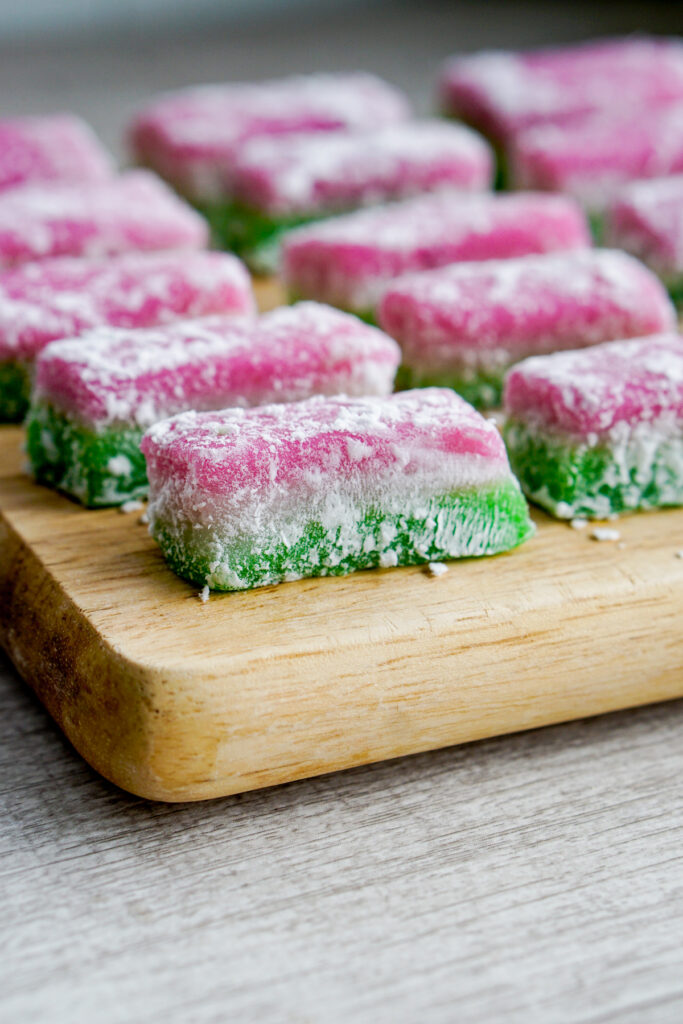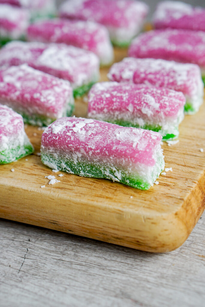 In any case, if you make my recipe as written in a 9×13″ pan in the oven, the process is just as simple. Layer the green mochi batter first, then bake until set. Repeat with the white layer. Then for the pink layer, cover the whole pan in aluminum foil and bake for 30 minutes. The edges may be a little dried out, so you can just cut those off and discard, but the inside will be perfectly moist and chewy.