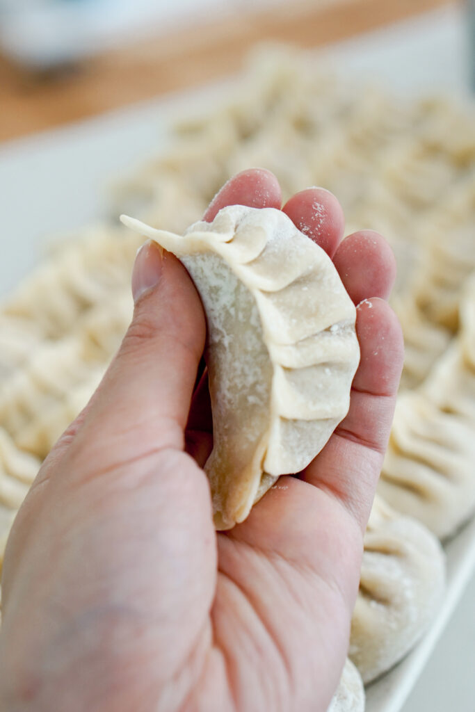 I will be the first to say that I am NOT an expert on folding dumplings. I honestly learned just from watching some videos. At home growing up, we used those plastic dumpling molds you can get from Daiso or other Asian markets (or Amazon). This is great if youโre new to dumpling making and short on time. But the problem with those is that you canโt get enough filling in the middle. It takes a lot of work and practice, but once you get it down, folding by hand is totally worth it. Iโll try to describe my way of folding dumplings as best as I can in the instructions, but I highly recommend watching some videos of dumpling folding. Hereโs mine: